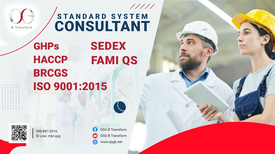 QSG B Transform คือทีมผู้เชี่ยวชาญที่มีประสบการณ์มากกว่า 18 ปี ในการให้บริการ ฝึกอบรม และ ให้คำปรึกษาพร้อมจัดทำเอกสาร สำหรับการจัดตั้งระบบมาตรฐานสากลในองค์กรทุกประเภท ทั้งโรงงาน อุตสาหกรรม บริการ GHP, HACCP, BRCGS Food,BRCGS Packaging, FSSC22000, ISO22000, ISO 9001, ISO 14001, ISO 45001,ISO 50001, amfori BSCI , Halal, SA8000, SMETA Sedex , RBA, มรท.8001, WCA, RJC, C-TPAT, ISCC,GRS