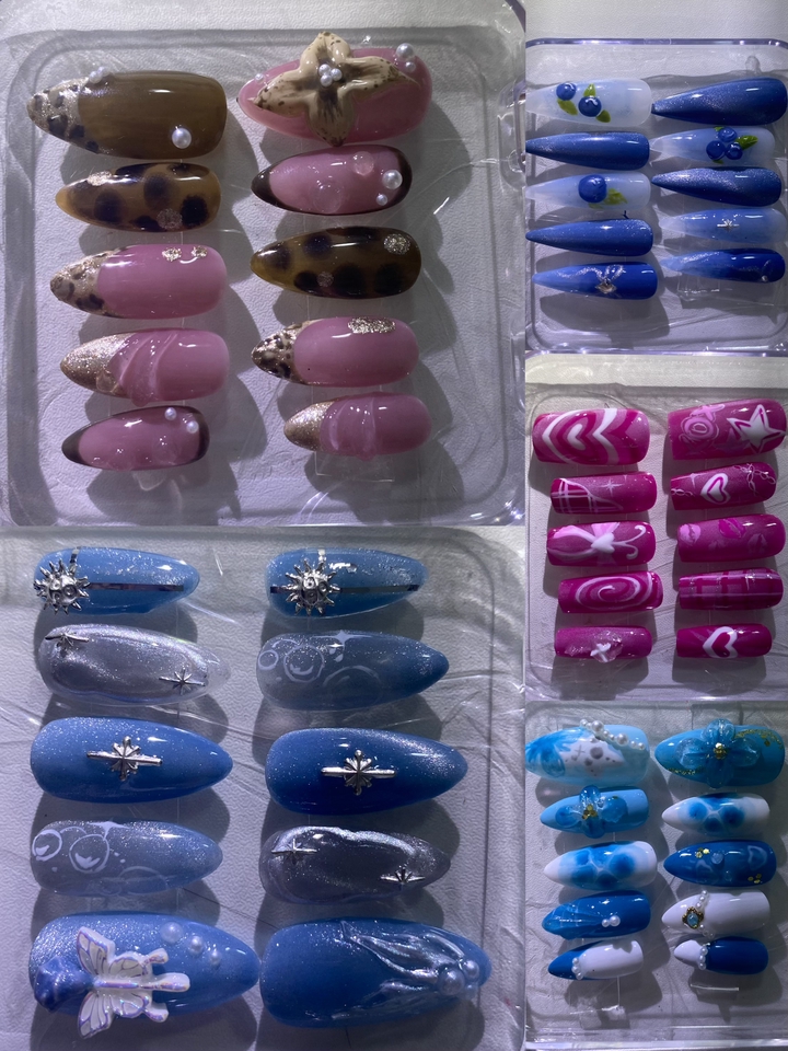 -รับออกแบบเล็บเจลสำเร็จรูป -เล็บเจลสำเร็จรูปพร้อมส่งพร้อมส่ง ราคา 99.- -รับทำตามเรฟ ราคาอยู่ที่รูปแบบเรฟที่ให้ -ตามเรฟเริ่มต้น150.- ออกแบบเริ่มต้น500.- -มีอุปกรณ์ให้ครบ ทุกขั้นตอนเหมือนทำที่ร้าน ขั้นตอนการทำงาน 1. ลูกค้าสอบถามราคา ตามเรฟ/ออกแบบ ตามบรีพ 2. ส่งรูปแบบการออกแบบให้ลูกค้าเช็ค 3. การทำใช้เวลา2-3วัน 4. ส่งงานให้ลูกค้า โดยems ลูกค้าแจ้งที่อยู่การจัดส่ง
