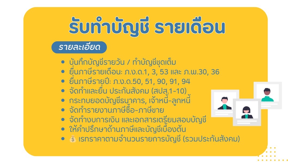 บันทึกรายการค้าและจัดทำสมุดรายวัน ซื้อ ขาย รับเงิน จ่ายเงิน และรายวันทั่วไป จัดทำและยื่นภาษีเงินได้เงินเดือนและค่าแรง (ภงด.1) จัดทำและยื่นภาษีเงินได้ หัก ณ ที่จ่าย บุคคลธรรมดา (ภงด.3) จัดทำและยื่นภาษีเงินได้ หัก ณ ที่จ่าย นิติบุคคล (ภงด.53) จัดทำและยื่น รายงานภาษี ซื้อ - ขาย แบบภาษีมูลค่าเพิ่ม (ภพ.30) จัดทำและยื่น รายงานภาษี ซื้อ - ขาย แบบภาษีมูลค่าเพิ่ม ต่างประเภท (ภพ.36) จัดทำภาษีเงินได้หัก ณ ที่จ่ายต่างประเทศ (ภงด.54) จัดทำและยื่นแบบประกันสังคม ปิดงบการเงินประจำเดือน ประจำปี ยื่นภาษีประจำปีนิติบุคคล ภงด.51 ภงด.50 ยื่นภาษีบุคคลธรรมดา ภงด.90 ภงด.91 ภงด.94 ยื่นงบการเงินกับกรมธุรกิจการค้า ให้คำปรึกษาเรื่องภาษีและเรื่องอื่นๆ หมายเหตุ ราคาขึ้นอยู่กับจำนวนรายการและความซับซ้อนทางธุรกิจ ขั้นตอนการทำงาน 1. รับเอกสารทางบัญชี ลูกค้าส่งเอกสารรายเดือน เช่น ใบกำกับภาษี, ใบเสร็จ, ใบโอนเงิน, เอกสารรับ–จ่ายต่าง ๆ 2. ตรวจสอบและจัดเรียงเอกสาร ตรวจความครบถ้วนของเอกสาร และจัดหมวดหมู่ให้เป็นระบบ 3. บันทึกรายการบัญชี ลงรายการในโปรแกรมบัญชี เช่น Express, QuickBooks หรือ Excel ตามมาตรฐานบัญชี 4. กระทบยอดบัญชี ตรวจสอบยอดบัญชีธนาคาร, ลูกหนี้, เจ้าหนี้ เพื่อความถูกต้อง 5. จัดทำรายงานภาษี จัดทำรายงานภาษีซื้อ–ขาย ยื่นแบบภาษีรายเดือน (ภ.ง.ด.1, 3, 53, ภ.พ.30, 36) 6. ยื่นประกันสังคม (ถ้ามี) จัดทำและยื่นแบบ สปส.1-10 7. ส่งมอบรายงานและสรุปผล สรุปรายงานบัญชี พร้อมไฟล์เอกสารหรือเอกสารกระดาษให้ลูกค้า