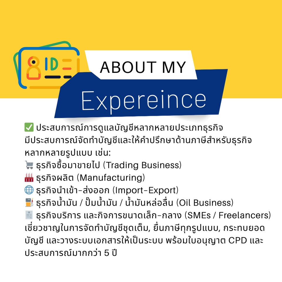 มีประการสบณ์ทำงานในสำนักงานบัญชี 4 ปี มี CPD ทำบัญชีบัญชีได้หลากหลายประเภทธุรกิจ สามารถปิดงบการเงินประจำปีได้ ยื่นภาษีนิติบุคคล/บุคคลธรรมดาได้ ประสบการณ์อื่นๆ มีประสบการณ์สอนพิเศษ เด็กประถม ถึง มัธยมต้น 7 ปี