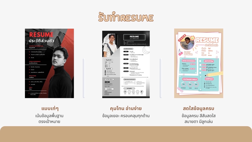 Resume หลากหลายสไตล์ ตามลูกค้าต้องการ เท่ๆ คุมโทน อ่านง่าย สีพาสเทลสดใส ไดคัทรูปได้