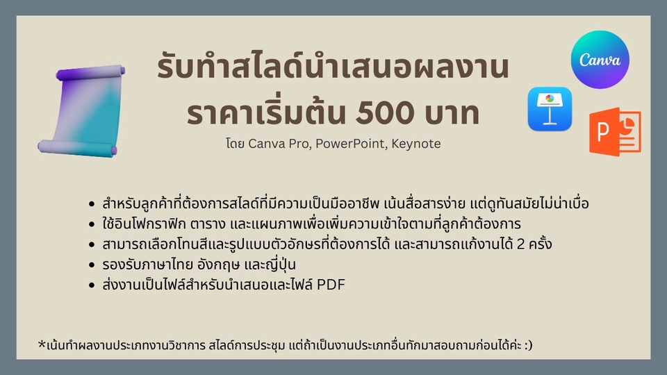 ฿500✔️ จำนวน 1-10 หน้า ✔️ เลือกโทนสี รูปแบบฟอนต์ที่ทางร้านเสนอให้ได้ ✔️ เลือกรูปแบบสไลด์ได้ ✔️ แก้ไขงานได้ 2 ครั้ง