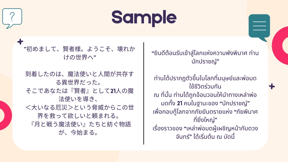 Professional translator/interpreter of more than 2 years of work experience, got 990/990 TOEIC score skilled at Thai to English and vice versa, English Major (Chulalongkorn Bachelor of Arts), extra knowledge on Japanese (passed N2)