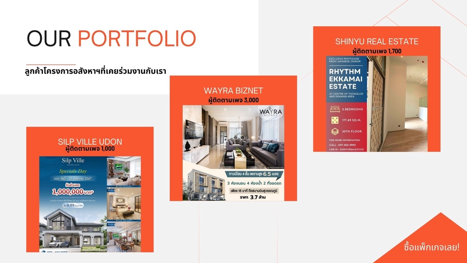 ฿55,000- โฆษณาออนไลน์ ผ่านช่องทางหลักตามที่ลูกค้าต้องการ ได้แก่ Facebook / Instagram / TikTok Google / YouTube / Line OA - วางแผนเจาะกลุ่มเป้าหมาย เช่น กลุ่มกำลังซื้อสูง กลุ่มมองหาบ้านหรือคอนโด ในระแวกโครงการ - วางแผนคอนเทนต์ และ การสื่อสารที่เหมาะสม - วางแผนงบประมาณ และ การรันโฆษณาจนจบแคมเปญ - Ads optimization and Ads monitoring ตลอด 30 วัน พร้อมให้คำปรึกษาตลอด - นำส่งรีพอร์ท พร้อมให้คำแนะนำ