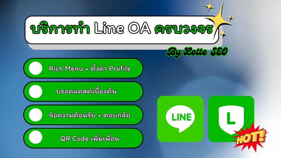 ระยะเวลาทำงาน 1-3 วัน 1. สร้าง LINE Official Account พร้อมตั้งค่าข้อมูลเริ่มต้น - ชื่อ LINE@ 2. สร้างข้อความต้อนรับ 3. สอน/สร้าง ข้อความตอบกลับอัตโนมัติสูงสุด 10 ข้อความ* 4. สอน/สร้าง Broadcast เบื้องต้น 5. สอน/สร้าง QR Code เพื่อนไลน์w สอนผ่าน Google Meet ชมตัวอย่างงาน และดูตัวอย่าง Line OA : https://lin.ee/gYTUPvl *ตามแต่ตกลงก่อนเริ่มงาน
