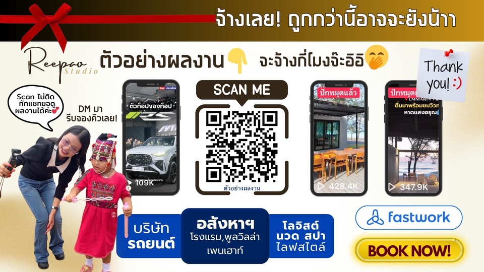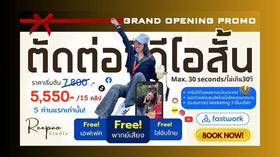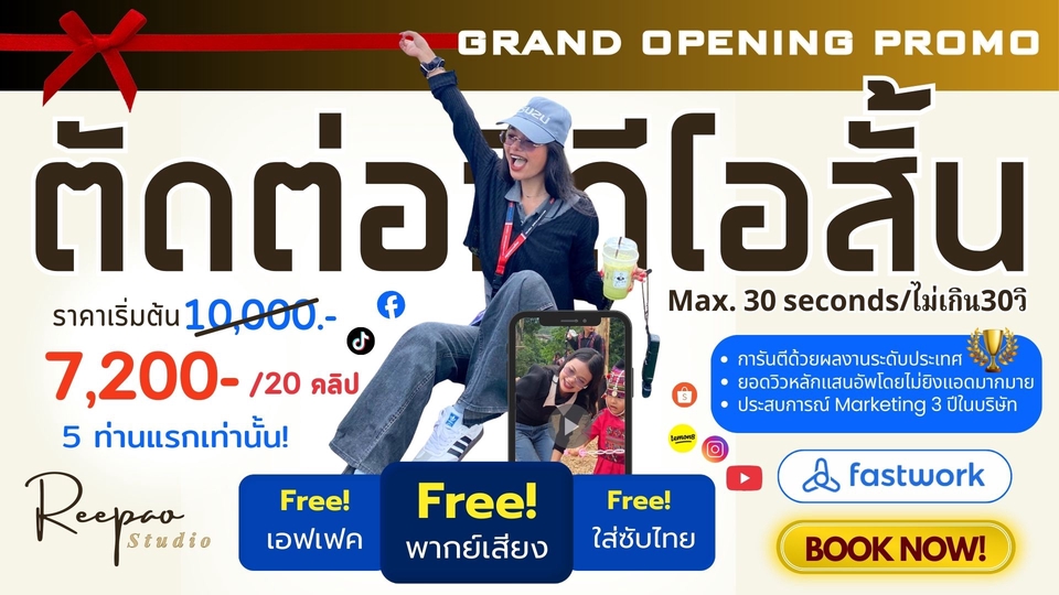 🔥 ถูกที่สุดแล้ว! 🎬 ตัดต่อคลิปสั้น ภายใน 30 วิ จาก Content Creator ประสบการณ์ 3 ปี ดูแลหลายแบรนด์ + มียอดวิวหลักแสนอัพออแกนิกหลายคลิป ❤️ 🎯 แพ็กเกจรายเดือนสุดคุ้ม (ยิ่งซื้อเยอะ ราคาต่อคลิปยิ่งถูก!) Starter Glow❤️🌱 – 15 คลิป/เดือน (เหมาะเริ่มสร้างเพจ) 📌 ราคาปกติ: 7,800 บาท (คลิปละ 520) 💥 โปรเปิดร้านเหลือเพียง: 5,550 บาท (คลิปละ 370) เหมาะกับเพจ/แบรนด์ที่ต้องการโพสต์ทุก 2 วัน + คุมโทนเพจให้เป๊ะ Daily Shine 💃🏻💎 – 20 คลิป/เดือน (เหมาะโพสต์ทุกวัน) 📌 ราคาปกติ: 10,000 บาท (คลิปละ 500) 💥 โปรเปิดร้านเหลือเพียง: 7,200 บาท (คลิปละ 360) เหมาะกับลูกค้าที่ต้องการคอนเทนต์ถี่ทุกวัน + เน้นผลลัพธ์แบบชัดเจน ⏱ งานเร่ง ทำเสร็จภายใน 24 ชม. +100 บาท/คลิป ✅ ส่งงานเป็นรอบ (Batch) – เช่น ส่งรอบแรก: 7 คลิป (ใน 7 วันแรก) ส่งรอบสอง: 8 คลิป (ก่อนครบ 15 วัน) ส่งรอบสาม: ที่เหลือ (ก่อนครบ 25-28 วัน) ✨ สิ่งที่คุณลูกค้าจะได้รับ ✅ ตัดต่อคลิป + ใส่ซับไตเติล + เพลง + เอฟเฟกต์พื้นฐาน ✅ พากย์เสียงฟรี! (เฉพาะโปร 5 ท่านแรก) ✅ ฟรีแก้ไข 1 รอบ/คลิป ✅ ไฟล์คุณภาพสูง พร้อมโพสต์ 📋 ขั้นตอนการจ้างงานง่าย ๆ 1️⃣ ส่ง Footage + เนื้อหา / Reference Style (ถ้ามี) 2️⃣ แจ้งบริการที่ต้องการ (งานเร่ง, เพิ่ม Motion, ฯลฯ) 3️⃣ ชำระเงินตามแพ็กเกจ 4️⃣ รับงาน + ตรวจแก้ 💌 รีบหน่อยน้า โปรนี้สำหรับ 5 ท่านแรกเท่านั้น! ส่งไฟล์ + บรีฟ แล้ว จ้างเลยจ้าาา~ 🎬❤️