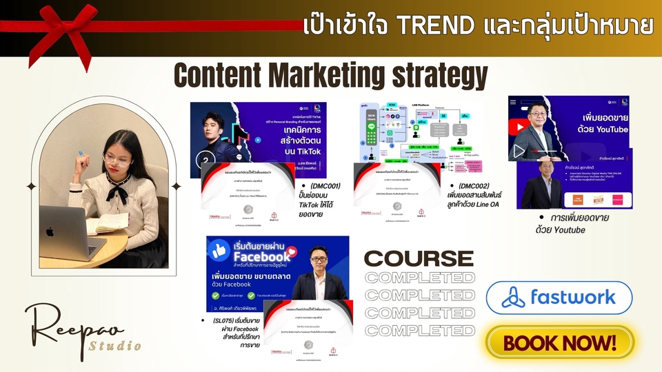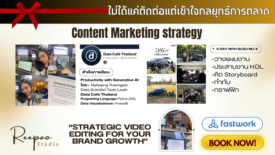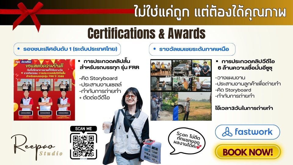 👩🏻💻 Content Creator ครบวงจร | Online Marketing 🏅 มีรางวัลระดับประเทศ & ภาค / ประสบการณ์บริษัท 3 ปี ✅ คิดสคริปต์-Storyboard, ถ่ายทำ-ตัดต่อ, พากย์เสียง ✅ วิเคราะห์คอนเทนต์ให้ตรงกลุ่มเป้าหมาย 📈 💖 คุยง่าย แก้งานได้ พร้อมดันแบรนด์คุณให้ปัง! 🚀
