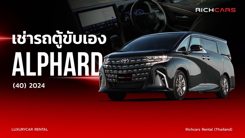 Alphard(40) 2024 สีดำ ราคา 15,000.- ต่อวัน ระยะเวลาเช่า 1 วัน นับ 24 ชั่วโมง เอกสารที่ใช้ในการเช่า 1. บัตรประชาชน /Passport 2. ใบขับขี่ / driver's license วิธีจองรถ : โอนจอง 5,000 บ. มัดจำรถ 30,000 บ. ค่ามัดจำกับค่ารถส่วนที่เหลือชำระตอนรับรถ ได้เลย คืนรถคืนมัดจำภายในวันหลังจากตรวจสภาพรถเรียบร้อย