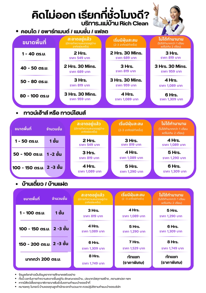 บริการของเรามีอะไรบ้าง? -ห้องนั่งเล่น พื้นที่ใช้สอยทั่วไป ทำความสะอาดทุกจุดที่มีฝุ่น ทำความสะอาดพื้นห้อง เช็คทำความสะอาดอุปกรณ์เครื่องใช้และจัดของให้เป็นระเบียบหรือตามคำสั่ง -ห้องนอน ทำความสะอาดฝุ่นอันไม่พึงประสงค์ จัดที่นอน ทำความสะอาดพื้น และ จัดของต่างๆให้เป็นระเบียบหรือตามคำสั่งของเจ้าของบ้าน -ห้องน้ำ ทำความสะอาดห้องน้ำ สุขภัณฑ์ เครื่องใช้ต่างๆ ในห้องน้ำ เช็ดกระจก ล้างพื้นและผนังห้องน้ำ -ห้องครัว เช็คคราบสกปรกที่เกิดขึ้นกับอุปกรณ์เครื่องใช้ในครัวเรือน ล้างจาน จัดอุปกรณ์ต่างๆให้เป็นระเบียบ ทำความสะอาดพื้นและคราบไม่พึงประสงค์ *มีการเก็บขยะในทุกๆพื้นที่ของบ้านและทิ้งในพื้นที่ๆได้รับมอบหมาย* *ราคานี้รวม* -ค่าเดินทางของผู้เชี่ยวชาญด้านความสะอาด -อุปกรณ์ทำความสะอาด -น้ำยาทำความสะอาดต่างๆ -ประกันค่าความเสียหายสูงสุด 5,000 บาท *หมายเหตุ* -บริการของ Rich Clean ไม่รวมถึงกิจกรรมอื่นๆที่ไม่เกี่ยวข้องกับการทำความสะอาด -การทำความสะอาดทั่วไปไม่ใช่การทำความสะอาดแบบ Big Cleaning -ไม่เป็นพื้นที่ๆไม่มีการทำความสะอาดมายาวนานหรือมีคราบฝังลึก -ไม่รวมการทำความสะอาดตู้เย็นและพัดลม (หากต้องการบริการนี้สามารถสอบถามเพิ่มเติม โดยอาจจะมีค่าบริการเพิ่มเติม) -ไม่ครอบคลุมการทำความสะอาดในที่สูงเกินกว่า 2.45 ม. -ไม่รวมถึงการรีดผ้าและซักผ้า วิธีการจอง 1.ทัก/แจ้ง/บอก/เช็ค/จ่าย/รอรับบริการ ขั้นตอนการทำงาน 1. ยืนยันการจอง 2. ให้บริการทำความสะอาด 3. แจ้งลูกค้าเช็คหน้างานเพื่อเช็คงาน 4. ส่งรูป Before After 5. จบงาน