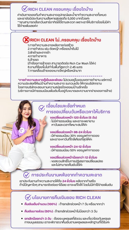 บริการของเรามีอะไรบ้าง? -ห้องนั่งเล่น พื้นที่ใช้สอยทั่วไป ทำความสะอาดทุกจุดที่มีฝุ่น ทำความสะอาดพื้นห้อง เช็คทำความสะอาดอุปกรณ์เครื่องใช้และจัดของให้เป็นระเบียบหรือตามคำสั่ง -ห้องนอน ทำความสะอาดฝุ่นอันไม่พึงประสงค์ จัดที่นอน ทำความสะอาดพื้น และ จัดของต่างๆให้เป็นระเบียบหรือตามคำสั่งของเจ้าของบ้าน -ห้องน้ำ ทำความสะอาดห้องน้ำ สุขภัณฑ์ เครื่องใช้ต่างๆ ในห้องน้ำ เช็ดกระจก ล้างพื้นและผนังห้องน้ำ -ห้องครัว เช็คคราบสกปรกที่เกิดขึ้นกับอุปกรณ์เครื่องใช้ในครัวเรือน ล้างจาน จัดอุปกรณ์ต่างๆให้เป็นระเบียบ ทำความสะอาดพื้นและคราบไม่พึงประสงค์ *มีการเก็บขยะในทุกๆพื้นที่ของบ้านและทิ้งในพื้นที่ๆได้รับมอบหมาย* *ราคานี้รวม* -ค่าเดินทางของผู้เชี่ยวชาญด้านความสะอาด -อุปกรณ์ทำความสะอาด -น้ำยาทำความสะอาดต่างๆ -ประกันค่าความเสียหายสูงสุด 5,000 บาท *หมายเหตุ* -บริการของ Rich Clean ไม่รวมถึงกิจกรรมอื่นๆที่ไม่เกี่ยวข้องกับการทำความสะอาด -การทำความสะอาดทั่วไปไม่ใช่การทำความสะอาดแบบ Big Cleaning -ไม่เป็นพื้นที่ๆไม่มีการทำความสะอาดมายาวนานหรือมีคราบฝังลึก -ไม่รวมการทำความสะอาดตู้เย็นและพัดลม (หากต้องการบริการนี้สามารถสอบถามเพิ่มเติม โดยอาจจะมีค่าบริการเพิ่มเติม) -ไม่ครอบคลุมการทำความสะอาดในที่สูงเกินกว่า 2.45 ม. -ไม่รวมถึงการรีดผ้าและซักผ้า วิธีการจอง 1.ทัก/แจ้ง/บอก/เช็ค/จ่าย/รอรับบริการ ขั้นตอนการทำงาน 1. ยืนยันการจอง 2. ให้บริการทำความสะอาด 3. แจ้งลูกค้าเช็คหน้างานเพื่อเช็คงาน 4. ส่งรูป Before After 5. จบงาน