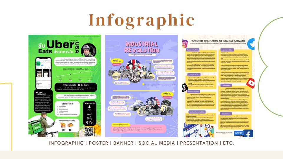เรากำลังศึกษาระดับปริญญาตรี ซึ่งมีความถนัดในด้านการออกแบบการทำ Infographic และ Presentation งานกราฟิกต่างๆ ผ่านโปรแกรม Procreate และ Canva ซึ่งได้มีผลงานทั้งการทำกราฟิกขององค์กรสโมสรนิสิต และงานในวิชาเอก ทุกท่านสามารถชมผลงานได้ตามข้างบนเลยค่ะ หากชอบสไตล์งานของเราสามารถเข้ามาพูดคุยสอบถามรายละเอียดได้เลยนะคะ 🫶🏻✨ ขั้นตอนการทำงาน 1. เลือกขนาดชิ้นงาน 2. บรีฟรายละเอียดงาน (หัวข้อ เนื้อหา ข้อมูล เรฟ) 3. ระยะเวลาทำงาน 2 วัน 4. ลูกค้าแก้งานได้ 2 ครั้ง