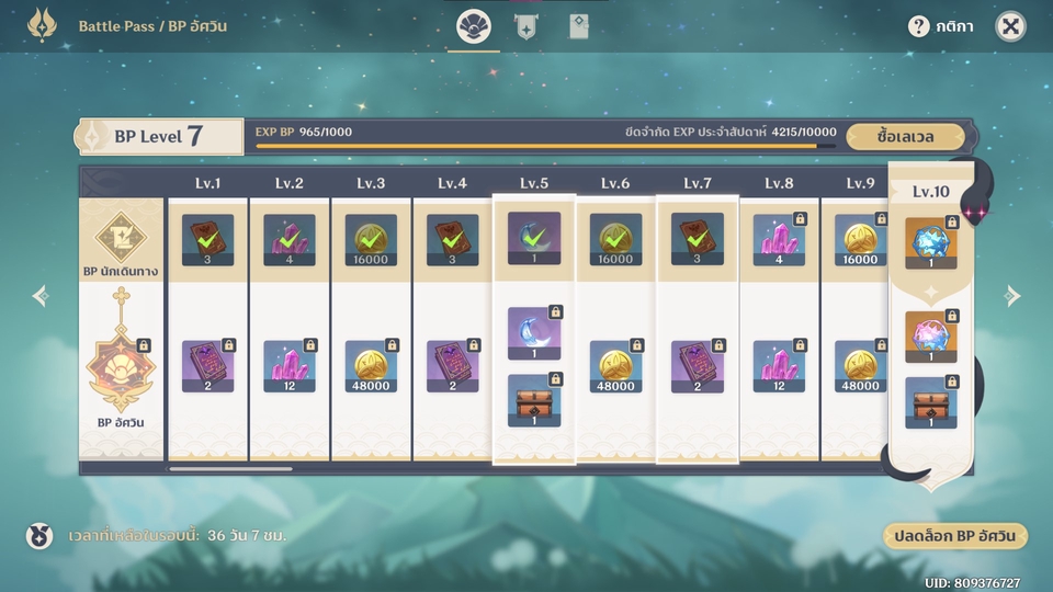 ฿200ดูแลไอดี 7 วัน - ทำเควสประจำวัน - เคลียร์ Resin 160 แต้ม/วัน (เลือกของที่ต้องการให้ฟามเองได้) - ส่งออกการสำรวจ / รับของรางวัลการออกสำรวจ - เก็บ Crsytal Core 10 ชิ้น ต่อวัน (หากต้องการให้เก็บอย่างอื่น สามารถบอกได้) - ทำเควส Battle Pass - ตีบอสรายสัปดาห์ - ตีบอสอัพตัวละคร - ทำเควสชื่อเสียง (เควสคำขอ, เควสปราบปราม / เลือกเมืองเองได้) - เคลียร์กิจกรรม Event - ให้คำแนะนำแนวทางการปั้นหรือปรับของตัวละคร