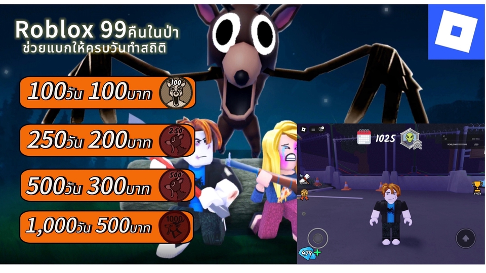 ผมเล่นrobloxเป็นประจำ ในแมพ99คืนในป่า ประสบการณ์และฝีมือมีมากพอสมควร จากสถิติของผม เล่นไปได้สูงสุด1,025วัน ผมจะช่วยพาคุณทำสถิติตามจำนวนวันที่คุณต้องการ คิดราคาถูกๆตามจำนวนวัน เวลาในการเล่น เริ่ม12:00น.-17:00น.