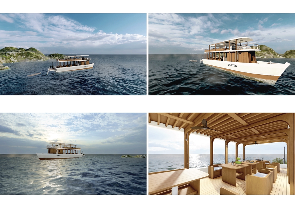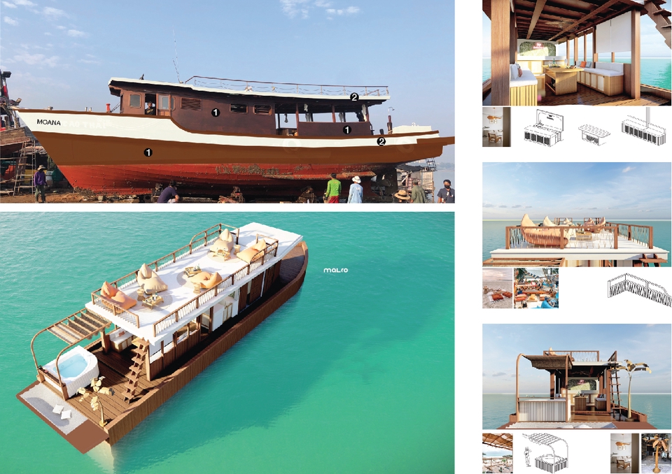 รับออกแบบเรือนำเที่ยว ลักษณะของเรือดัดแปลงจากเรือประมง หรือเรือหางยาวขนาดเล็ก การออกแบบ เป็นการจำลองแบบ 3D ภายนอกและภายในของเรือ เช่น แบบบิ้วอิน, กำหนดสีภายนอก, การวางผังที่นั่ง เป็นต้น -- เงื่อนไข -- * ไม่รวมการออกแบบเครื่องยนต์เรือ การออกแบบห้องเครื่อง หรือโครงสร้างหลักของเรือ ** ไม่รวมการออกแบบกราฟิก โลโก้ ขั้นตอนการทำงาน 1. Stage 1 Briefing – Information –Site Survey แบบขั้นต้น ออกแบบวางผังโครงการ สำรวจพื้นที่หน้างาน 2. Stage 2 Conceptual - Preliminary Design รูปลักษณะอาคารตามแนวความคิดเบื้องต้น ผังพื้นโครงการ (Plan) ภาพบรรยากาศโครงการที่เป็นจริงที่จะเกิดขึ้น (Perspective) 3. Stage 3 Final Presentation ผังพื้นโครงการ (Plan) ภาพบรรยากาศโครงการที่เป็นจริงที่จะเกิดขึ้น (Final Rendering) ตัวอย่างวัสดุที่ใช้ในโครงการ (Material Mood Board) 4. Stage 4 Construction Drawings แบบก่อสร้าง Digital File 5. เข้าตรวจสอบหน้างานระหว่างก่อสร้าง