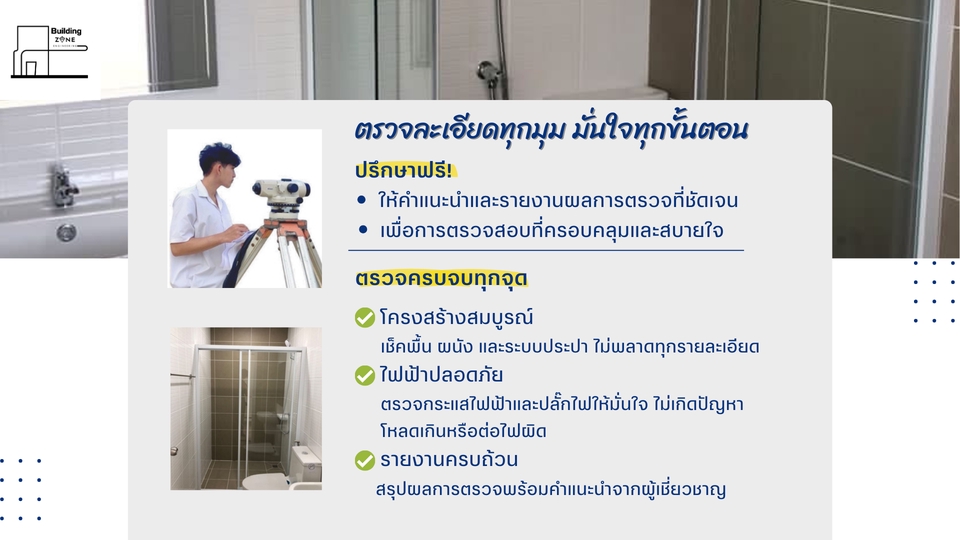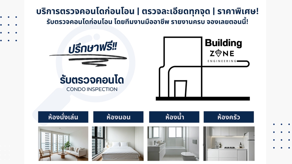 ด้วยประสบการณ์การทำงานด้านก่อสร้างและวิศวกรรมโยธา พร้อมใบประกอบวิชาชีพที่ถูกต้อง ผมและทีมงานเชี่ยวชาญในการรับเหมาก่อสร้างและตรวจสอบงานอย่างละเอียด เพื่อให้มั่นใจว่าทุกขั้นตอนเป็นไปตามมาตรฐานสูงสุดและป้องกันปัญหาในอนาคต การบริการตรวจคอนโดโดย Building Zone: - ทีมงานผู้เชี่ยวชาญ ตรวจสอบได้อย่างละเอียดและครบถ้วน - มีอุปกรณ์ที่ใช้สำหรับการตรวจสอบโดยเฉพาะ - มาตรฐานการตรวจชัดเจน มั่นใจในคุณภาพและความปลอดภัย - รายงานผลละเอียด พร้อมภาพถ่ายและคำอธิบายเข้าใจง่าย - บริการครบวงจร รวมถึงการให้คำปรึกษาและตรวจซ้ำหลังการแก้ไข - ความน่าเชื่อถือและประสบการณ์ สร้างความไว้วางใจจากลูกค้า เงื่อนไขเพิ่มเติม: - ราคานี้สำหรับพื้นที่กรุงเทพฯเท่านั้น (พื่นที่ปริมณฑลและอื่นๆอาจมีค่าใช้จ่ายเพิ่มเติม) - ตรวจสอบครั้งที่สองหลังการแก้ไขงานเสร็จ - ตรวจสอบเพิ่มเติมอาจมีค่าใช้จ่าย - ราคานี้รวม VAT แล้ว - ส่งมอบรายงานภายใน 5 วันทำการหลังการตรวจสอบ ขั้นตอนการทำงาน 1. นัดหมายวันและเวลาตรวจสอบ ตรวจสอบข้อมูลรายละเอียดเบื้องต้น 2. ตรวจสอบครั้งแรกด้วยมาตรฐานวิศวกรรม บันทึกปัญหาหรือข้อบกพร่อง 3. จัดทำรายงานพร้อมคำแนะนำในการแก้ไข ส่งให้ลูกค้าและผู้รับเหมา 4. ตรวจสอบครั้งที่สองเพื่อยืนยันการแก้ไขปัญหา และจัดทำรายงานครั้งที่สอง 5. ส่งมอบรายงานขั้นสุดท้าย พร้อมคำแนะนำการบำรุงรักษาเพิ่มเติม
