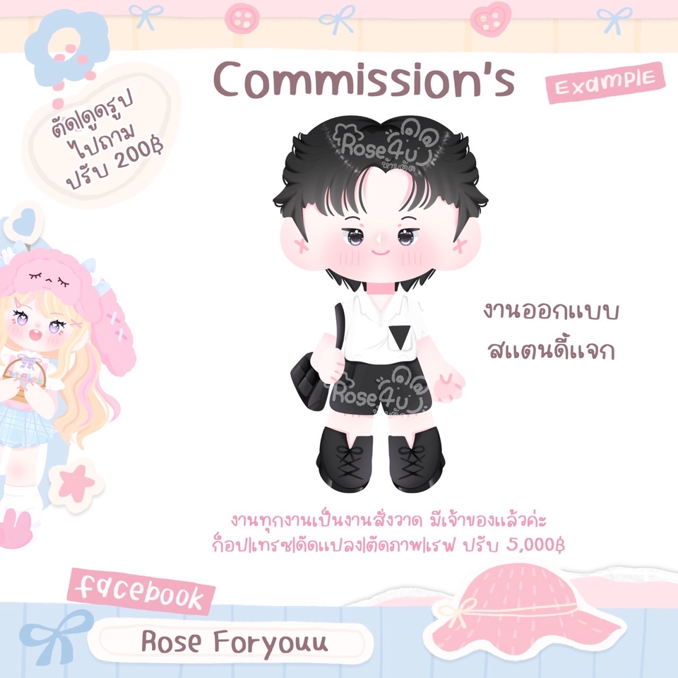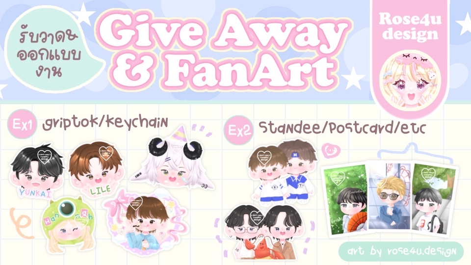 รับวาดตัวการ์ตูนจิบิน่ารักๆทำ Give away แจกค่ะ ลูกค้าสามารถนำงานไปใช้ทำสติกเกอร์/สแตนดี้/โปสการ์ด/โปสเตอร์ ฯลฯ ได้หมดเลยค่ะ เรทราคาจะขึ้นอยู่กับรายละเอียดงานและความยาก-ง่ายของงานค่ะ ปล.ร้านไม่ได้รับวาดฉากหลังหรือตัวละครที่มีดีเทลซับซ้อนหรือละเอียดมากนะคะ (อาจมีปรับ-ลดตามความถนัดเพื่อให้เข้ากับสไตล์งานของร้านอีกทีค่ะ) ขั้นตอนการทำงาน 1. แจ้งจำนวนภาพและรายละเอียดที่ต้องการให้ชัดเจน 2. แจ้งจุดประสงค์ของการนำไปใช้ให้ชัดเจน เช่น นำไปทำพวงกุญแจ / ทำโปสการ์ด แจก 3. ส่งรายละเอียด/บรีฟงาน/โทนสีในงานให้ครบถ้วน หากรับแบบมีพื้นหลังจะต้องบรีฟพื้นหลังมาด้วยนะคะ (ร้านไม่รับวาดแบบที่มีรายละเอียดเยอะค่ะ) 4. หลังบรีฟงาน+ชำระเงินเรียบร้อยแล้ว ทางร้านจะลงคิวให้ค่ะ (มีลิงค์คิวงานให้คอยเช็ค) 5. เมื่อถึงคิวเริ่มงาน ร้านจะส่งร่างงานให้ 1 ครั้ง (สามารถขอแก้ร่างงานได้ฟรี 2 ครั้ง ครั้งต่อไป+ครั้งละ 30฿) 6. หากส่งร่างงานผ่านแล้ว ร้านจะนำงานไปลงสีให้ดูก่อนคร่าวๆ และจะส่งดราฟโทนสีให้เช็คอีก 1 ครั้งค่ะ (สามารถขอแก้สีบางจุดได้ แต่ไม่อนุญาตให้แก้โทนสีทั้งหมดหรือแก้ทั้งภาพค่ะ) 7. เมื่อดราฟสีผ่านแล้ว ร้านจะเก็บรายละเอียดของงานต่อทันทีและส่งงานไฟนอลให้ค่ะ 8. ใช้เวลาทำทั้งหมด 3-7 วันหลังจากที่เริ่มคิวงานค่ะ