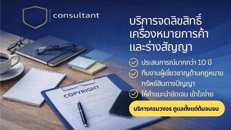 1. บริการจดลิขสิทธิ์ - ให้คำปรึกษาว่าผลงานสามารถจดลิขสิทธิ์ได้หรือไม่ - วิเคราะห์ประเภทผลงานและขอบเขตความคุ้มครอง - จัดเตรียมและตรวจสอบเอกสาร - ดำเนินการยื่นคำขอจดแจ้งลิขสิทธิ์ - ติดตามผลและให้คำแนะนำหลังการจด 2. บริการจดทะเบียนเครื่องหมายการค้า - ตรวจสอบเบื้องต้น - ให้คำแนะนำเกี่ยวกับชื่อ / โลโก้ / ขอบเขตสินค้าและบริการ - จัดทำและยื่นคำขอจดทะเบียนเครื่องหมายการค้า - ติดตามสถานะและแจ้งความคืบหน้า - ให้คำแนะนำกรณีมีคำสั่งจากนายทะเบียน 3. บริการร่างและตรวจสัญญา - ร่างสัญญาทั่วไป - ตรวจและปรับปรุงสัญญา - ให้คำอธิบายข้อสัญญาและความเสี่ยง หากคุณต้องการผู้เชี่ยวชาญด้านกฎหมายและทรัพย์สินทางปัญญา ที่ให้คำแนะนำชัดเจน ดูแลครบ และคำนึงถึงประโยชน์ของลูกค้าเป็นหลัก เรายินดีให้บริการอย่างมืออาชีพ