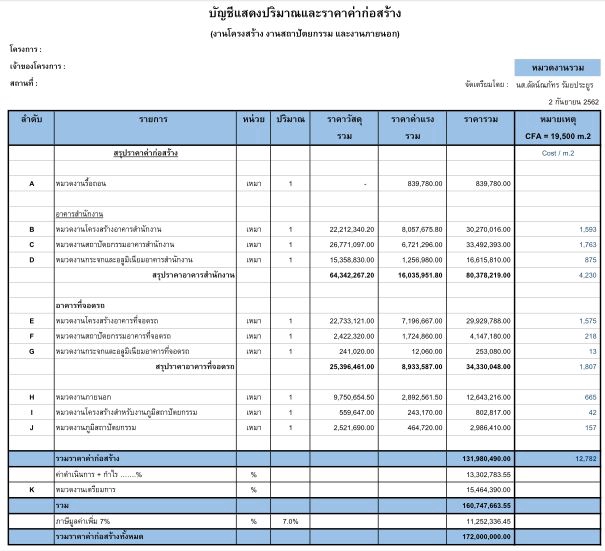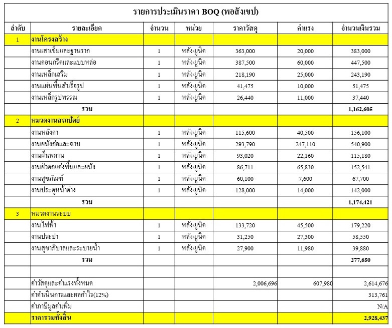 จัดทำ BOQ ราคากลาง สำหรับอาคารทั่วไป รวมทุกระบบงานตามแบบ