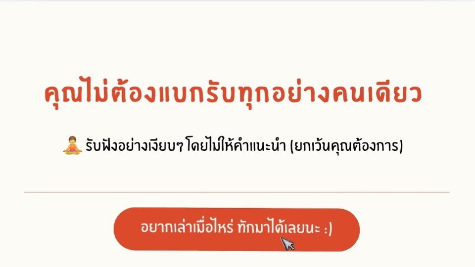 "พร้อมรับฟังคุณ...อย่างแท้จริง โดยไม่ตัดสิน" 🤍 รับฟังด้วยใจ เปิดพื้นที่ปลอดภัยให้คุณเป็นตัวของตัวเอง ไม่ว่าคุณจะอยากเล่าเรื่องเครียดในชีวิต ความเหนื่อยล้าจากงาน ปัญหาความสัมพันธ์ หรือแค่ต้องการคนที่พร้อมจะรับฟัง เราพร้อมอยู่ข้างคุณเสมอ ทักมานะคะ :)