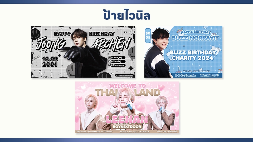 รับออกแบบป้ายไวนิล ป้ายรถตุ๊กตุ๊ก ป้ายรถแห่ ป้ายรถฟู้ดทรัค Xstand RollUp J-Flag สำหรับโปรโมทศิลปินหรือป้ายร้านค้า ทำได้หลายสไตล์ ทั้งแบบน่ารักสดใส Luxury มินิมอล หรือดาร์คๆเท่ๆ ต้องการให้ออกแบบงานประเภทอื่นๆสอบถามได้เลยค่ะ • ราคาแต่ละแพ็คเกจเป็นเพียงราคาเริ่มต้น ราคาขึ้นอยู่ที่ความยากง่ายของงาน/ขนาด/จำนวนรูปที่ต้องไดคัท/รายละเอียดอื่นๆ • *ป้ายขนาดไม่เกิน1เมตร รายละเอียดไม่เยอะคิดราคาเริ่มต้นไม่บวกเพิ่ม* • สิ่งที่ได้รับ • - ไฟล์ Jpg,png, aiหรือpsd • การแก้ไขงาน • - เป็นการแก้ไขแบบจุดเล็กๆเช่น ขยับตำแหน่งเล็กน้อย เอาข้อความออก เพิ่มข้อความเล็กน้อย ฯลฯ - ไม่ใช่การเปลี่ยนคอนเซปใหม่ เช่นเปลี่ยนแบบน่ารักเป็นแบบเท่ เปลี่ยนโทนสีใหม่ เปลี่ยนแนวตั้งเป็นแนวนอน เปลี่ยนรูปใหม่ **1ชิ้นงาน1ดีไซน์ คือ1ป้าย กรณีสั่งป้ายรถแห่ที่มี3ป้าย ต้องเลือก แพ็กเกจ3** ขั้นตอนการทำงาน 1. รับบรีฟจากลูกค้า 2. เริ่มทำงานให้ตามความต้องการของลูกค้า 3. เมื่อทำเสร็จจะส่งให้ลูกค้าเช็คความเรียบร้อย แก้ไขงานได้3ครั้ง (ครั้งถัดไป+ครั้งละ50บาท) 4. หากมีแก้ไขงานทางร้านจะแก้แล้วส่งให้เช็คอีกครั้งหนึ่ง 5. เมื่องานเสร็จสมบูรณ์ จะทำการส่งงานให้ทางgoogle drive