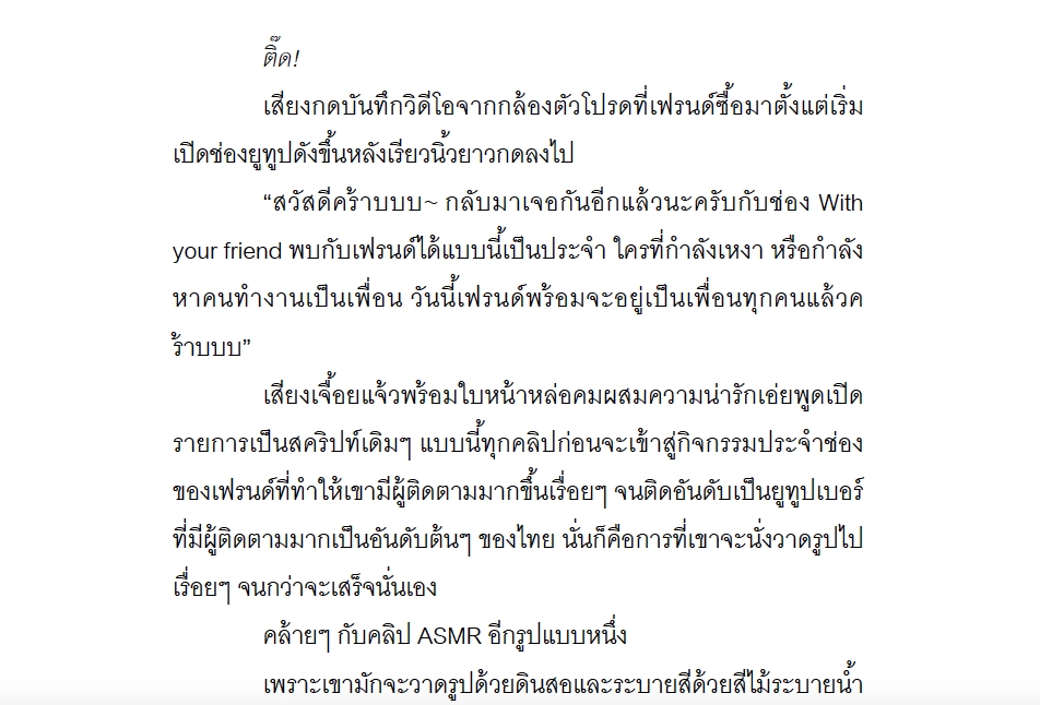 >> รับพิสูจน์อักษรภาษาไทย ทุกประเภทงาน เช่น บทความ เอกสารวิชาการ ต้นฉบับนวนิยาย เรื่องสั้น รีวิว แฟนฟิค ฯลฯ >> โดยมืออาชีพจบการศึกษาจากคณะอักษรศาสตร์ สาขาวิชาภาษาไทย มหาวิทยาลัยศิลปากร **รับทั้งงานด่วนและไม่ด่วน : งานด่วนบวกเพิ่ม** >> ตรวจทานตัวสะกด การใช้คำทับศัพท์ต่าง ๆ แก้ไขคำผิดตามหลักภาษาไทย โดยยึดหลักตามพจนานุกรมราชบัณฑิตยสถาน พ.ศ. 2554 หรือตามแบบพิมพ์นิยม (แล้วแต่ความต้องการของลูกค้า) >> ตรวจดูความเหมาะสมของการใช้คำ การเว้นวรรค และการใช้เครื่องหมายสัญลักษณ์ >> ตรวจการจัดวางข้อความให้ดูสวยงาม สละสลวย เหมาะสมกับบริบท รวมทั้งการจัดหน้ากระดาษ (แล้วแต่ความต้องการของลูกค้า) >> ยินดีตรวจแก้ตามความต้องการของลูกค้า >> ระยะเวลาการทำงานประมาณ 7 วัน หากจำนวนหน้าต่ำกว่า 300 หน้า สามารถส่งงานได้ภายใน 5 วัน (สามารถสอบถามหรือพูดคุยรายละเอียดงานก่อนได้ครับ) ขั้นตอนการทำงาน 1. รับงานและพูดคุยรายละเอียดกับผู้ว่าจ้าง 2. ทำงานตามขั้นตอนพิสูจน์อักษร 3. ส่งงานให้ผู้ว่าจ่าง