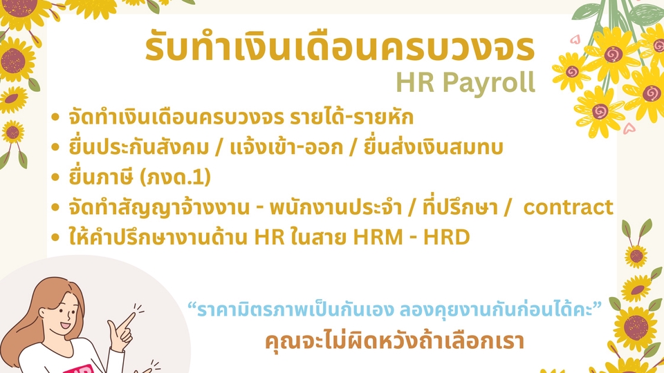 HR Payroll - จัดทำเงินเดือนครบวงจร ที่ปรึกษาด้านการทำเงินเดือนแบบครบวงจร รายละเอียดบริการ 1.คำนวณเงินเดือน - รายได้ / OT / โบนัส / เบี้ยเลี้ยง / เบี้ยขยัน / อื่นๆ - รายหัก / ปกส / ภาษี / เงินกู้ยืม / ขาด,ลา,มาสาย / อื่นๆ - สลิปเงินเดือนพนักงาน 2.ยื่นประกันสังคม - แจ้งเข้า-ออกจากระบบ e-Service ( ออนไลน์ ) - ยื่นเงินสมทบ ปกส 3.ยื่นภาษี ภงด.1 ขอบเขตงาน - รองรับพนักงาน 1-50 คน - แก้ไขงานให้ 1-2 ครั้ง หลังส่งมอบงาน - ส่งงานผ่านอีเมล์ / ไลน์ ตามที่ลูกค้าสะดวก รับประกันความถูกต้อง ติดปัญหาตรงไหนสามารถแก้ไขให้ทันที ทำงานรวดเร็วทันใจแน่นอนคะ 📩 สนใจจ้างงานหรือต้องการสอบถามรายละเอียดเพิ่มเติม กดติดต่อได้เลยค่ะ!