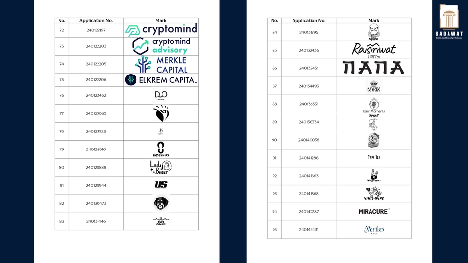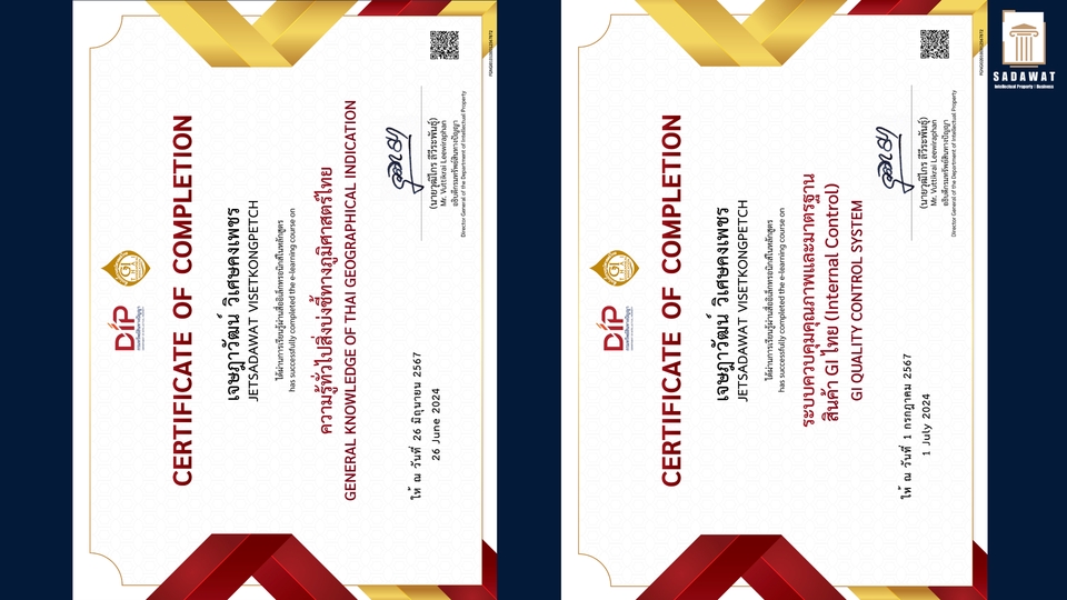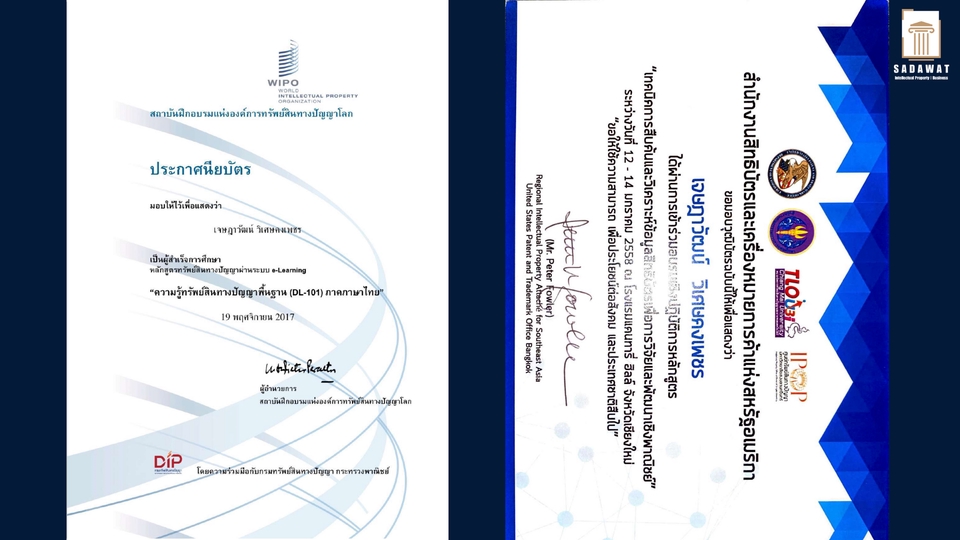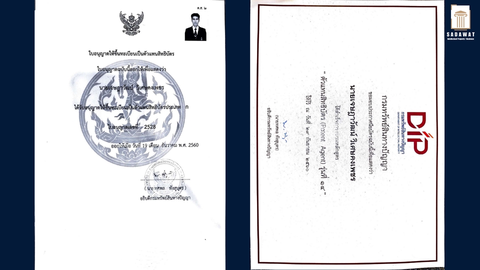 - ตัวแทนสิทธิบัตรเลขที่ 2528 (ประสบการณ์ทำงาน 10 ปี) - ที่ปรึกษาทางการเงิน (Financial Advisor) - ผู้แนะนำการลงทุนตราสารทั่วไป (IC License-Plain) เลขที่ 126555 - ผู้เชี่ยวชาญด้านเครื่องหมายการค้า สิทธิบัตร อนุสิทธิบัตร สิทธิบัตรการออกแบบผลิตภัณฑ์ ลิขสิทธิ์ และการวางแผนการเงินและภาษีอากร