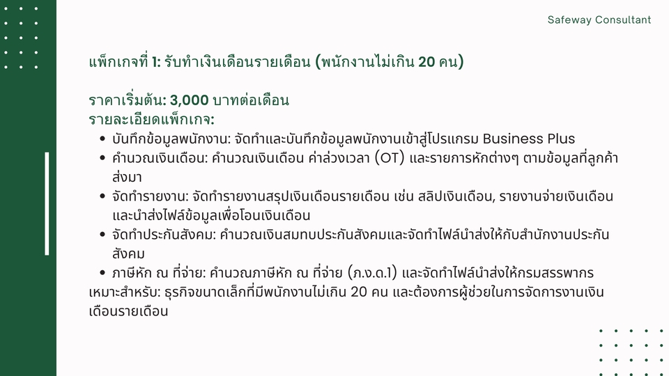 แพ็กเกจที่ 1: รับทำเงินเดือนรายเดือน (พนักงานไม่เกิน 20 คน)