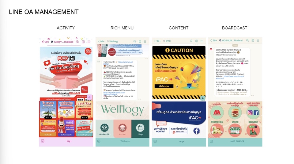 รับดูแลงาน Admin Line official Account แบบรายวีค/รายเดือน - สร้าง Broadcast - ลงโพสต์ใน Timeline - สร้าง Coupon/ Rich Message/ Greeting Message และอื่นๆ ขั้นตอนการทำงาน 1. รับบรีฟจากลูกค้า และสรุปรายละเอียดงานที่จะเกิดขึ้น 2. ผลิต Artwork และ Message ส่งให้ลูกค้า Approve ระยะเวลาประมาณ 1-2 วันต่อชิ้นงาน 3. สามารถปรับแก้ไขได้ไม่เกิน 2 ครั้งต่อชิ้นงาน 4. เมื่อลูกค้า Approve แล้ว จะไม่สามารถแก้ไขได้ และจะ set schedule ให้ตามเวลาที่ลูกค้าแจ้ง เพื่อทำการ Broadcast