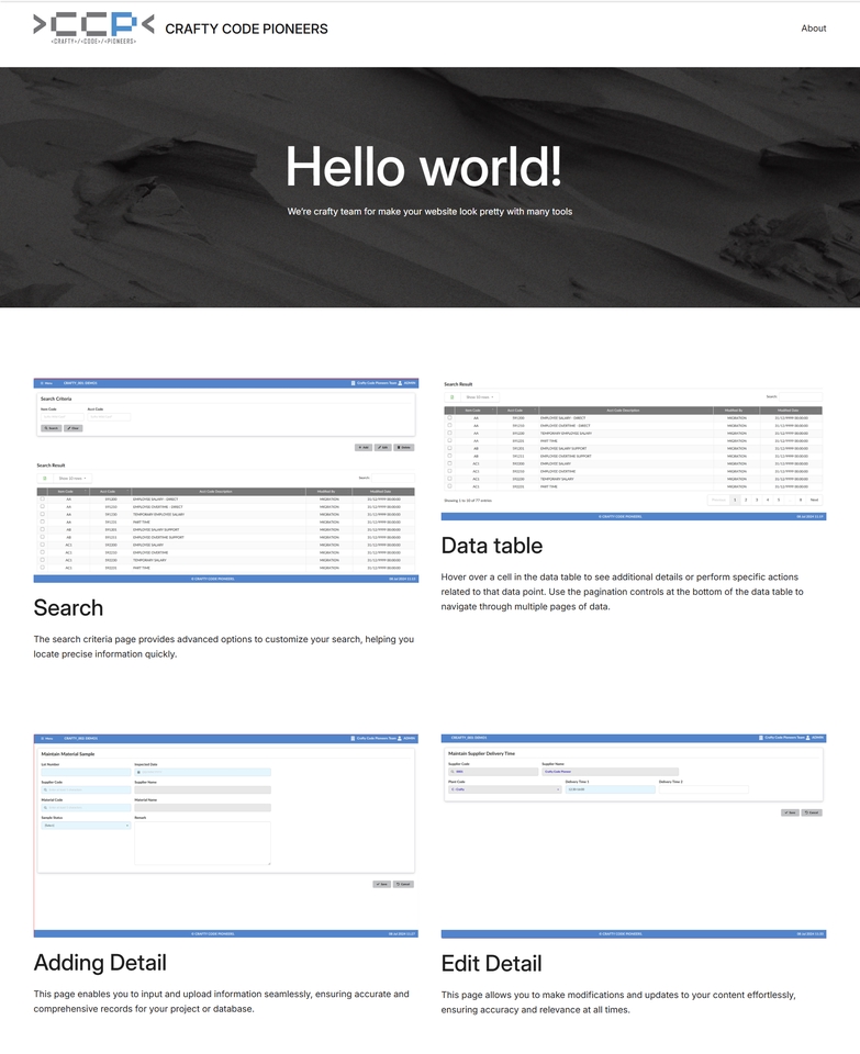 ตัวอย่างแสดงผลงานของทางทีม ในรูปแบบของ wordpreass ที่แสดงผลงานของทีมซึ่งเกี่ยวกับการค้นหาข้อมูลตามความต้องการของผู้ใช้งาน โดยสามารถเพิ่มข้อมูล แก้ไขข้อมูล และลบข้อมูลที่ไม่ได้ใช้งาน ขั้นตอนการทำงาน 1. get requirement 2. design 3. develop 4. test