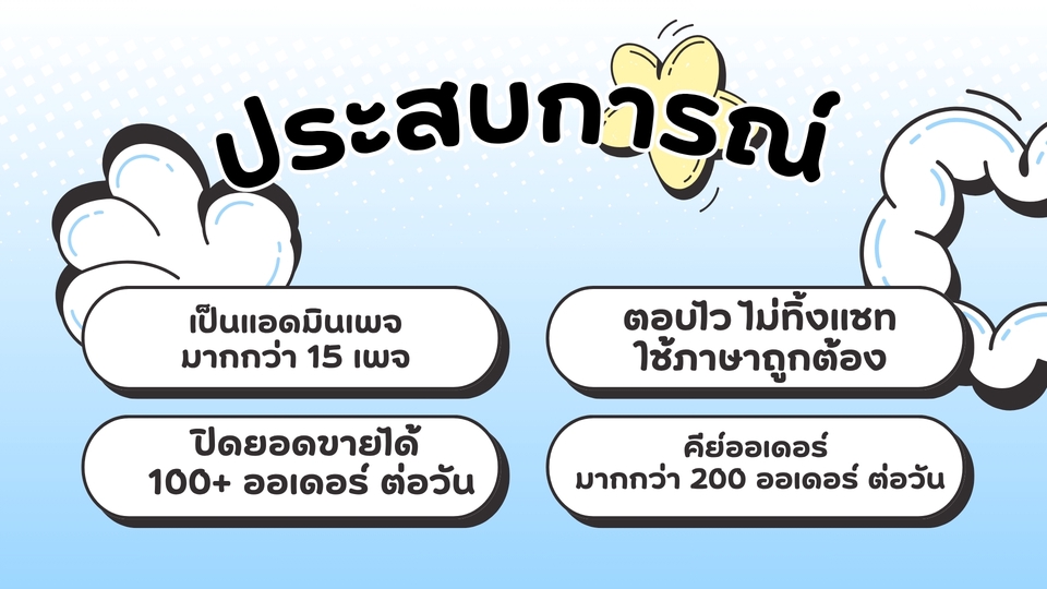 📌 ทำไมต้องเลือกเรา : 1. เราเข้าใจว่าแอดมินคือด่านสุดท้ายก่อนที่คุณจะขายสินค้าได้ 2. เรามีหัวใจการบริการ 3.ออนไลน์ได้สูงสุด12 ชั่วโมงต่อเนื่อง ตกลงวันและเวลาทำงานเพิ่มเติมได้ 4. มีประสบการณ์ในการทำงานด้านนี้มามากกว่า 2 ปี 5. สามารถใช้โปรแกรมต่างๆในการลงออเดอร์ เช่น Excel,My order และอื่นๆ . 🗒️ ขั้นตอนการทำงานสำหรับ 1. แจ้งเงื่อนไขและระยะเวลาในการทำงาน 2. ตกลงราคาการจ้างงาน 3. ลูกค้าแจ้งข้อมูลของสินค้า และบรีฟเนื้องาน 4. ตกลงเริ่มงาน ขั้นตอนการทำงาน 1. รับรายละเอียดงาน ที่ลูกค้าต้องการจะทำ 2. แจ้งแพ็กเกจและราคา 3. ตอบแชทตามที่ลูกค้าแจ้งมา 4. ส่งข้อมูลให้ลูกค้าก่อนปิดงาน 5. ปิดงานและส่งงานทั้งหมด