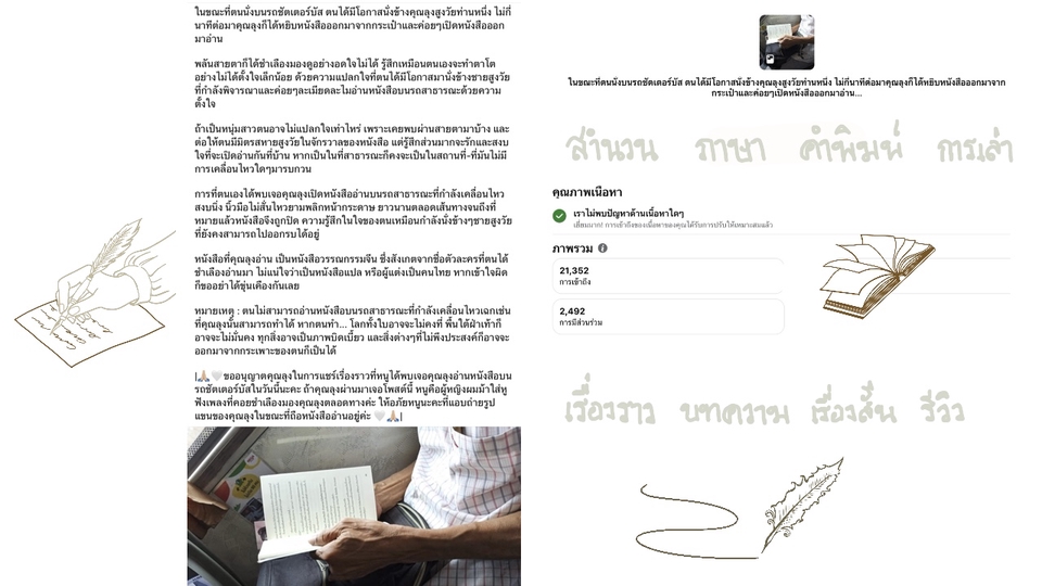 เขียนบทความ เรื่องสั้น รีวิวหนังสือ เล่าเรื่องราว รวมไปถึงหัวข้อต่างๆที่น่าสนใจ