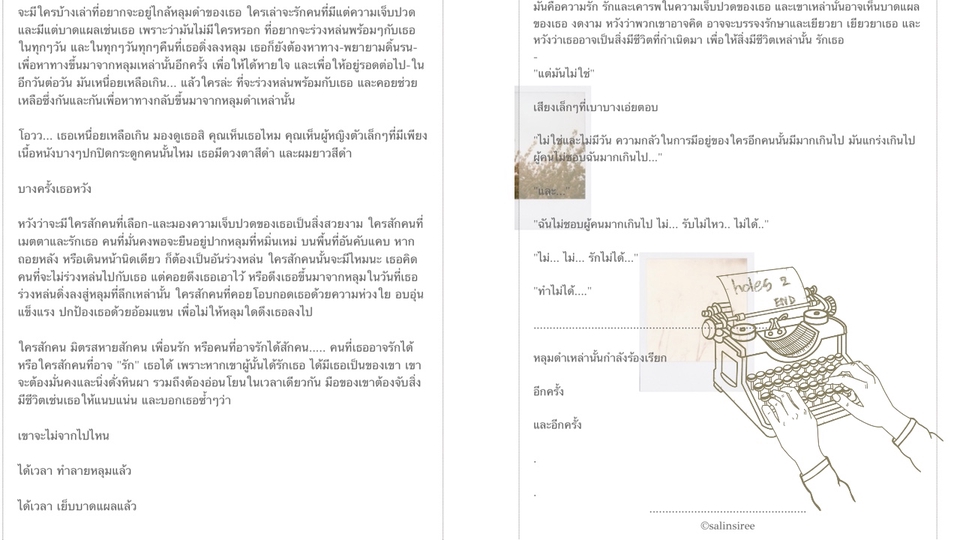 • รายละเอียดงาน รับงานเขียนบทความ เรื่องสั้น รีวิวหนังสือ รวมถึงเล่าเรื่องต่างๆที่น่าสนใจ - บทความ 400 - 500 คำ : เริ่มต้น 400 บาท - เรื่องสั้น 1000 คำ : เริ่มต้น 500 บาท - รีวิวหนังสือ 700 - 800 คำ : เริ่มต้น 400 บาท หัวข้ออื่นๆ ที่ผู้เขียนสนใจ สามารถติดต่อสอบถามได้ค่ะ ( นับคำด้วย Microsoft Word ) • ขั้นตอนการทำงาน (อาจมีการปรับให้เข้ากับงานและผู้ว่าจ้าง) • บทความ : พูดคุยเรื่องหัวข้อบทความและเนื้อหาในการเขียน หากพิจารณาในเบื้องต้นแล้วผู้เขียนสามารถสร้างสรรค์บทความในหัวข้อที่ผู้ว่าจ้างสนใจ ก็จะทำการรวบรวมข้อมูลและแนวทางในงานเขียนต่อไป - ร่างโครงเรื่องเพื่อปรับแก้ไขในเบื้องต้น - เริ่มงานและอัพเดทความคืบหน้าเป็นระยะ - ส่งงานให้ตรวจสอบ เพื่อปรับแก้ไข (สามารถแก้ไขงานได้ไม่เกิน 3 ครั้งหรือตามตกลง) - ส่งมอบงานด้วยไฟล์งานที่ตกลงไว้ - ระยะเวลาการทำงาน 3 - 4 วัน หรือขึ้นอยู่กับเนื้องานในกรณีที่มีความละเอียดในเนื้อหาและความยาวของเรื่องราว ทั้งนี้จะทำการพูดคุยและตกลงในเรื่องนี้ก่อนเริ่มงาน • เรื่องสั้น : พูดคุยในหัวข้อของเรื่องที่ต้องเขียน และเนื้อหาในการเขียน หากพิจารณาในเบื้องต้นแล้วผู้เขียนสามารถสร้างสรรค์เรื่องราวในแบบที่ผู้ว่าจ้างสามารถพึงพอใจ ก็จะทำการรวบรวมข้อมูลและแนวทางในงานเขียนต่อไป - ร่างโครงเรื่อง เพื่อเสนอปรับแก้ไขในเบื้องต้น - เริ่มงานและอัพเดทความคืบหน้าเป็นระยะ - ส่งงานเพื่อตรวจสอบและปรับแก้ไข (สามารถแก้ไขได้ไม่เกิน 4 ครั้งหรือตามตกลง) - ส่งมอบงานด้วยไฟล์งานที่ตกลงไว้ - ระยะเวลาการทำงาน ไม่เกิน 7 วันในกรณีที่เป็นเรื่องสั้น หรือขึ้นอยู่กับเนื้อหาความยาวและรายละเอียดของงาน ทั้งนี้จะทำการพูดคุยและตกลงในเรื่องนี้ก่อนเริ่มงาน • เล่าหนังสือ รีวิวหนังสือ : ผู้เขียนจะรับพิจารณาหนังสือที่เป็นแนวทางของตนเป็นหลัก ที่ตนชื่นชอบหรือหลงรัก แต่ผู้เขียนก็สนใจในอีกหลากหลายเรื่องราวที่ผู้ว่าจ้างอาจจะเสนอมา เพราะผู้เขียนเป็นนักอ่าน และอยากเขียนเรื่องราวของหนังสือต่างๆ เพื่อเพิ่มโอกาสให้กับหนังสือเล่มนั้นให้ได้มีโอกาสถูกหยิบขึ้นมาอ่านไม่มากก็น้อยสามารถติดต่อพูดคุยเพื่อสนทนากันก่อนได้ค่ะ - หากเป็นหนังสือที่ผู้เขียนยังไม่เคยอ่าน จะต้องใช้เวลาอ่าน และจะเริ่มเขียนเรื่องราวเกี่ยวกับหนังสือเรื่องนั้นๆทันที ที่อ่านจบ เมื่ออ่านจบแล้วจะแจ้งให้ทราบในทันที - ระยะเวลาในการทำงาน ขึ้นอยู่กับความหนาบางของหนังสือ แต่ไม่เกิน 7 วันหรือเร็วกว่านั้น 3 - 4 วันตามเนื้อหาของเรื่องราว - ส่งงานเพื่อตรวจสอบและปรับแก้ไข (ในบางกรณี) - ส่งมอบงาน