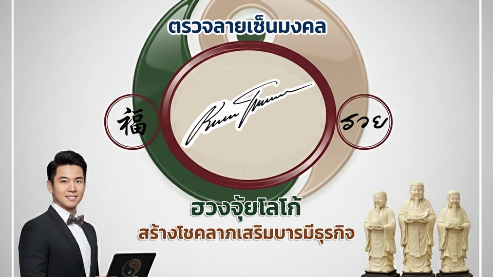 ลายเซ็น (Signature) เป็นสัญลักษณ์ที่เป็นตัวแทนของบุคคล โดยมีลักษณะเป็นอัตลักษณ์ที่มีความจำเพาะเจาะจงความเป็นปัจเจกนิยมขอบบุคคล โหงวเฮ้งลายเซ็น เป็นการศึกษาลักษณะเส้นสายของลายเซ็น องค์ประกอบของลายเซ็น น้ำหนักของลายเซ็น และตำแหน่งของลายเซ็น โดยโหงว คือ 5 และเฮ้ง คือ ลักษณะที่ถูกส่งตรงมาจากความคิดและจิตใจ เป็นมโนกรรม (มโนกรรม คือ กรรมที่เกิดจากความคิด เป็นจุดเริ่มต้น เป็นตัวการใหญ่ เป็นประธาน เป็นเจ้าของ) โดยส่งผลถึงสุขภาพ ร่างกาย อารมณ์ บุคลิก พฤติกรรม ความสัมพันธ์กับคนรอบข้าง ชื่อเสียง และทรัพย์สินเงินทอง โดยทั้งหมดจะสรุปรวมเป็นเรื่องหลัก ๆ ที่สำคัญ คือ ชีวิต การเงิน การงาน ความรัก และสุขภาพ โหงวเฮ้งลายเซ็น เป็นศาสตร์ความรู้ที่สามารถแก้ไข ปรับปรุง เพิ่มเติมให้ดีขึ้นได้ เช่นเดียวกันกับฮวงจุ้ย ที่สามารถแก้ไขส่วนที่เป็นปฏิบักหักล้างกัน และเพิ่มเติมส่วนที่เกื้อหนุนส่งเสริมมากยิ่งขึ้น • ชีวิต ..ดีขึ้น • การเงิน ..ดีขึ้น • การงาน ..ดีขึ้น • ความรัก ..ดีขึ้น • สุขภาพ ..ดีขึ้น เริ่มต้นด้วยการปรับปรุงแก้ไขลาเซ็น ขั้นตอนการทำงาน 1. เมื่อท่านกดจ้างงาน ท่านสามารถส่งรูปลายเซ็นที่ต้องการวิเคราห์มาให้ได้ 2. วิเคราห์ สรุป ส่งไฟล์ผลการวิเคราห์โหวเฮ้งลายเซ็น พร้อมคำแนะนำในการแก้ไข ให้ท่านโดยเร็วที่สุด ภายในระยะเวลา 3 วันทำการ