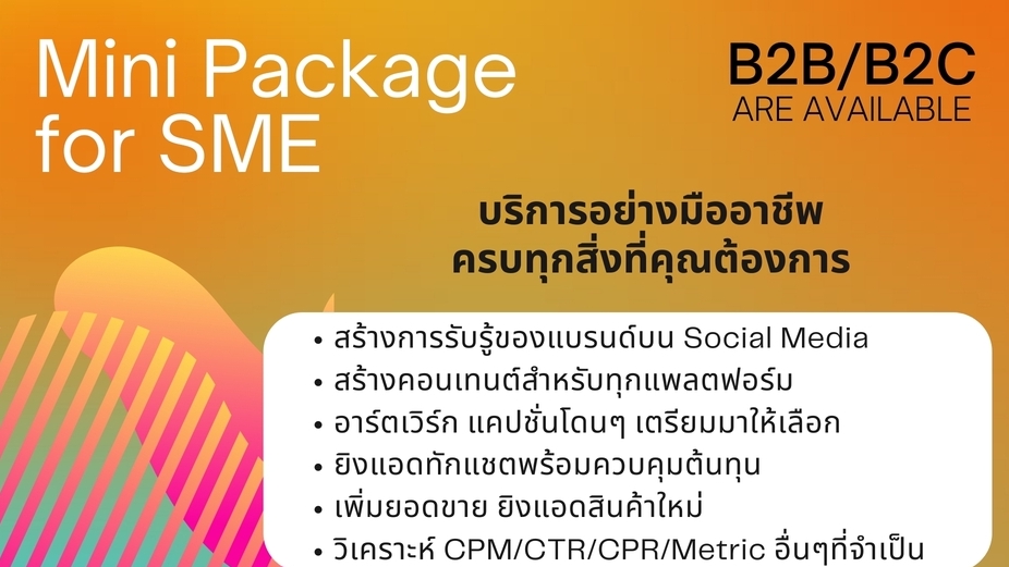 แพ็คเกจคุ้มๆ สำหรับ SME - สร้างเพจ เซ็ตอัพโปรไฟล์ธุรกิจ - สร้างคอนเทนต์ อาร์ตเวิร์กและแคปชั่น - วางแผนการสื่อสาร การเรียงลำดับคอนเทนต์ - สร้างตัวจัดการธุรกิจ บัญชีโฆษณาสำหรับยิงแอด - ให้บริการทั้ง Facebook, Instagram, Twitter, Line - บริการให้คำปรึกษาด้านการตลาด - แนวทางการยิงแอดแบบทักแชต สินค้า ปิดการบายและสร้างการมองเห็น - มีให้บริการทั้งกลุ่มตลาด B2B และ B2C - เจาะลึกกลุ่มเป้าหมาย วิเคราะห์กลุ่มลูกค้าก่อนทำการสื่อสาร - Hashtag ที่จำเป็น ขั้นตอนการทำงาน 1. แจ้งข้อมูลแพ็กเกจที่ต้องการ 2. ส่งข้อมูลเพจ 3. ตกลงรายละเอียด 4. ลูกค้าทำการชำระเงิน 5. แอดไลน์เพื่อคุยและส่งงาน