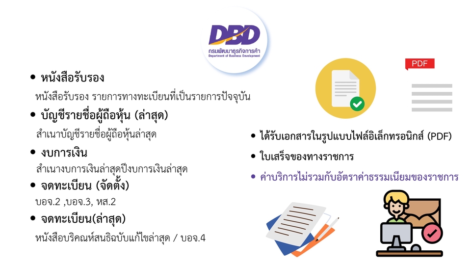 คัดเอกสาร หนังสือรับรอง ,บัญชีรายชื่อผู้ถือหุ้น,งบการเงิน, จดทะเบียน(จัดตั้ง),จดทะเบียน(ล่าสุด) -ได้รับเองสารเป็นไฟล์ PDF -ใบเสร็จทางราชการ **ค่าบริการไม่รวมค่าธรรมเนียมของทางราชการ