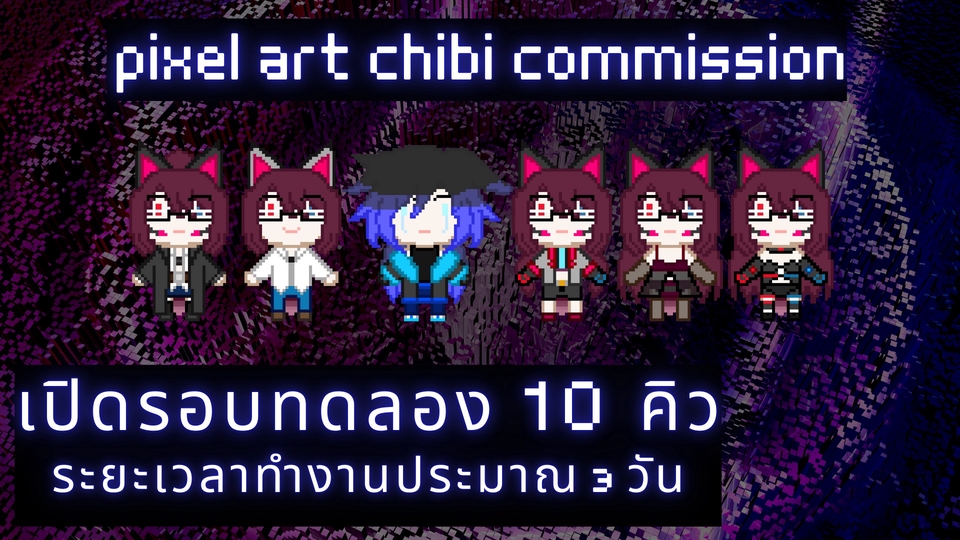 เป็นงานจิบิ สไตล์Pixel Art ลักษณะจะเหมือนกับตัวละครในเกมแนวRPG รายละเอียดงานเรียบง่าย แต่ขึ้นอยู่กับตัวละครที่วาด เป็นงานที่ทำแล้วสนุกมากๆ ได้ลองทำงานวาดแบบใหม่ ตัวละครที่รับวาด - ออริ - ตัวละครจากเกม อนิเมะ - ตัวละครอดอป - วีทูปเบอร์ ตัวละครที่ไม่รับวาด - คนแก่ - ตัวละครที่รูปร่างใหญ่ เช่น อ้วน มีกล้าม - Furry - หุ่นยนต์ - ตัวละครจากซีรี่ย์จีน - ตัวละครจากเกม Kingdom Heart ขั้นตอนการทำงาน 1. ทางเรามีเบสวาดภาพเป็นของตัวเองอยู่แล้ว สิ่งที่ลูกค้าต้องส่งมาคือ ตัวละคร กับ บอกสีหน้าของตัวละครที่จะวาด 2. เมื่อเราตกลงรายละเอียดกับลูกค้าไปแล้ว เราจะเริ่มทำการลงเส้นคร่าวๆลงไปในตัวงาน เพื่อให้ลูกค้าดูส่วนที่อยากแก้ 3. เมื่องานเสร็จสมบูรณ์ เราจะส่งไฟล์ไปให้ทางอีเมลล์ของลูกค้าค่ะ