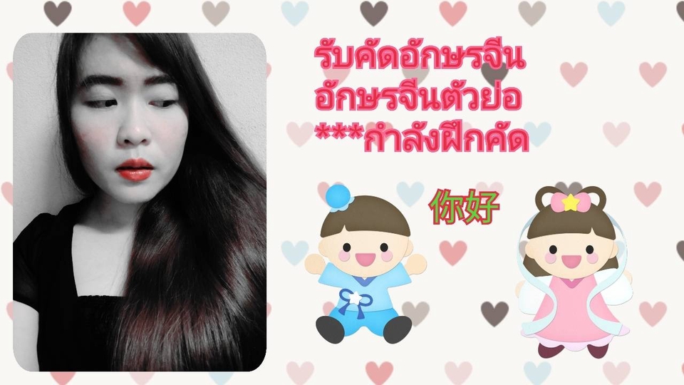 รับคัดอักษรจีนตัวย่อ และรับทำเกี่ยวกับงานพิมพ์อักษรจีนตัวย่อ (ตอนนี้กำลังฝึกคัดอักษรภาษาจีนตัวย่อ) จบจากมหาวิทยาลัยราชภัฏนครปฐม เอกการจัดการทั่วไป ขั้นตอนการทำงาน 1. สอบถามรายละเอียดงานความยากความง่ายในการคัด 2. ตกลงราคาและวันส่งงาน 3. เริ่มการพิมพ์งานและการเขียนอักษรจีน 4. ทำงานเสร็จส่งงาน