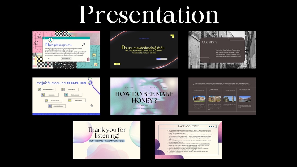ปัจจุบันเป็นนิสิตชั้นปีที่ 4 มหาวิทยาลัยเกษตรศาสตร์ ภาควิชานิเทศศาสตร์ คณะมนุษยศาสตร์ สามารถออกแบบ presentation ได้หลักหลายสไตล์ค่ะ สไตล์ที่ถนัดจะเป็นแบบมินิมอล สบายตาค่ะ ขั้นตอนการทำงาน 1. ลูกค้าบรีฟงาน ส่งเนื้อหา แจ้งไสตล์ที่ต้องการและจำนวนหน้า 2. รับบรีฟและเริ่มงาน 3. เสร็จงานจะส่งให้ลูกค้าพรูฟต่อค่ะ