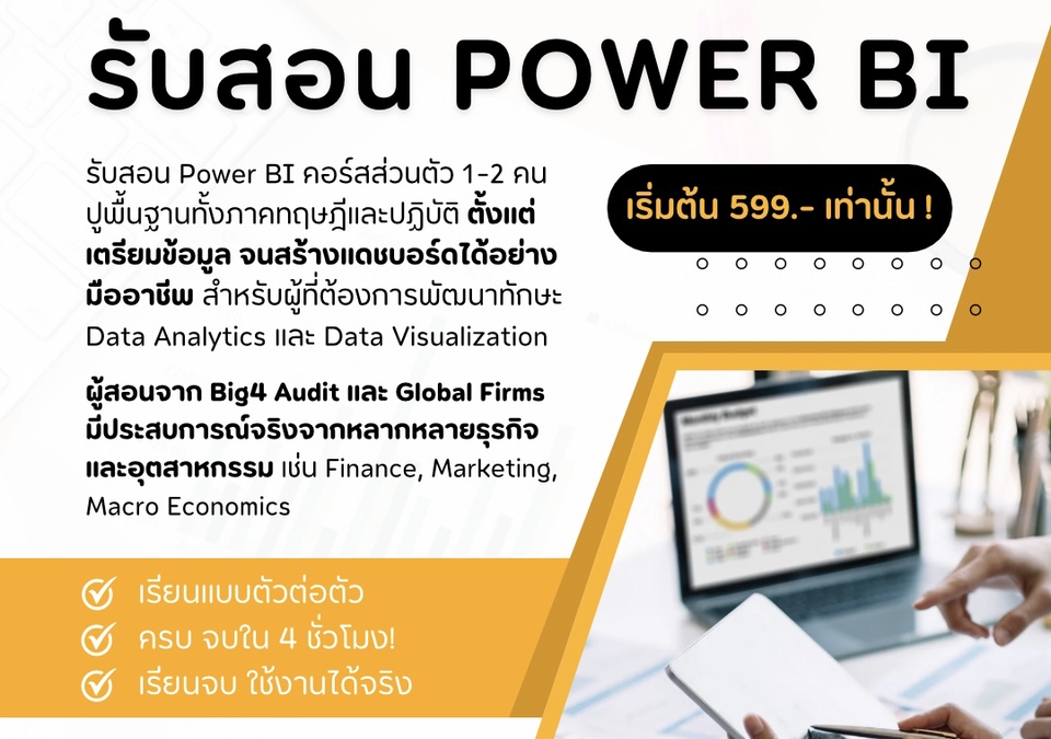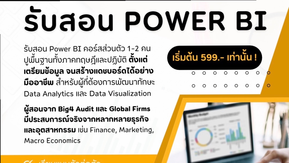 เปิดรับสอน Power BI ตัวต่อตัว / แบบคู่! เหมาะสำหรับสาย Data Analytics และคนที่อยากเริ่มต้นทำ Dashboard แบบมืออาชีพ เริ่มตั้งแต่ปูพื้นฐาน เตรียมข้อมูล จนสร้าง Dashboard ได้เอง สอนโดยผู้มีประสบการณ์ตรงจาก Big4 Audit และ Global Firms ผ่านงานจริงจากหลากหลายอุตสาหกรรมทั้ง Finance, Marketing และ Macro Economics • เรียนแบบตัวต่อตัว • ใช้งานได้จริง ไม่ใช่แค่ทฤษฎี • จบครบใน 4 ชั่วโมง • มีทั้งแบบ online และ on-site ค่าเรียน 799฿/คน/ชั่วโมง (เรียน 2 คน ลดเหลือ 599฿/คน/ชั่วโมง) ขั้นตอนการทำงาน 1. นัดหมายตกลงชั่วโมงและสถานที่จัดการเรียนการสอน 2. สอนคอร์ส Power BI 3. มอบการบ้านและตรวจการบ้าน
