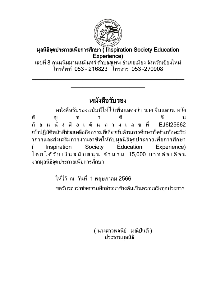 จบการศึกษาจากคณะบริหารธุรกิจ สาขาบัญชี ขณะนี้ทำงานบริษัทวีซ่าและโรงเรียนสอนภาษา เป็นงานเกี่ยวกับเอกสารราชการ เอกสารสำคัญต่างๆ มีประสบการณ์การจัดทำหนังสือ เอกสารราชการ ใบเสร็จ ใบกำกับภาษีต่างๆ และงบการเงิน ขั้นตอนการทำงาน 1. แจ้งเนื้อหารายละเอียดงาน ประเมินราคา และวันรับงาน 2. แจ้งใบเสนอราคา และชำระเงิน 3. รับไฟล์ต้นฉบับ และข้อมูลจากลูกค้าทั้งหมด 4. ปฏิบัติงานตามระยะเวลาที่กำหนด (รวมถึงระยะเวลาแก้ไข) 5. ส่งงาน