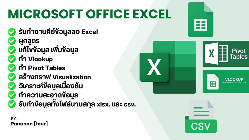 รับงานคีย์ข้อมูลทั่วไปโดยใช้โปรแกรม microsoft excel ในราคานักศึกษา งานที่รับทำ -คีย์ข้อมูลลงไฟล์ -ผูกสูตร -ทำความสะอาดข้อมูล -ทำ pivot table -ทำ vlookup -วิเคราะห์ข้อมูลเบื้องต้น -ทำ visualization และงานอื่นๆ สามารถสอบถามได้ ยินดีรับทำงานเพื่อเพิ่มประสบการณ์ในการทำงานของตนเองครับ ส่วนราคาสามารถคุยเพื่อตกลงร่วมกันได้ ขั้นตอนการทำงาน 1. พูดคุยและทำความเข้าใจในสิ่งที่ลูกค้าต้องการ 2. ตกลงวันส่งงาน/ราคา/ชำระเงิน 3. เริ่มทำงานตามที่ได้รับมอบหมาย 4. ตรวจเช็กผลงาน/ความเรียบร้อย และส่งให้ลูกค้าเพื่อรับ feedback 5. แก้ไขผลงาน 6. ส่งผลงาน final เพื่อเสร็จสิ้นการทำงาน