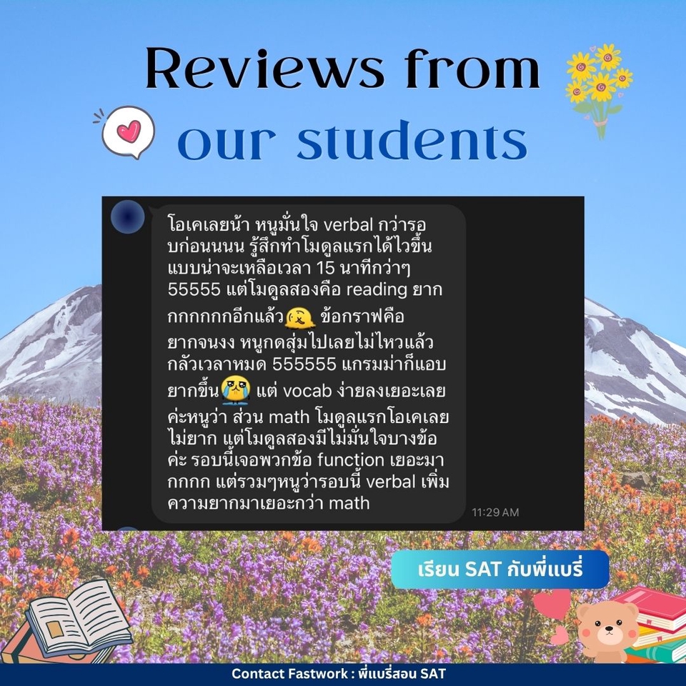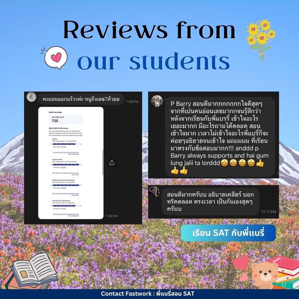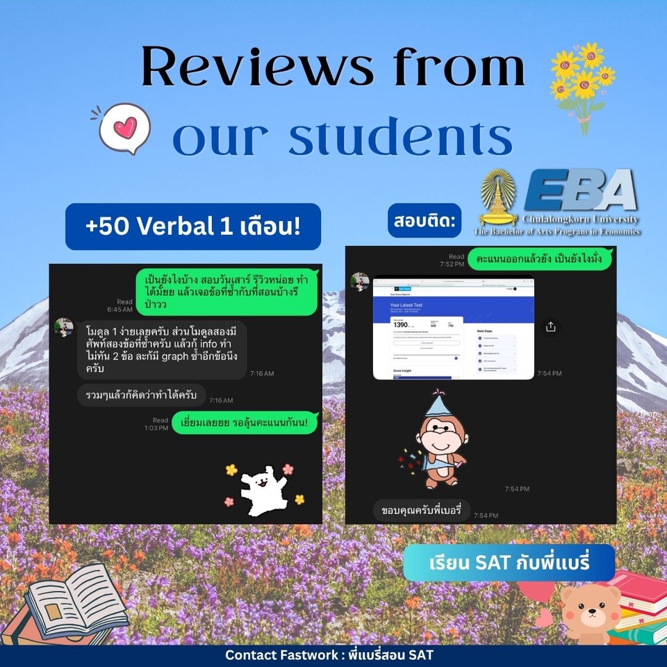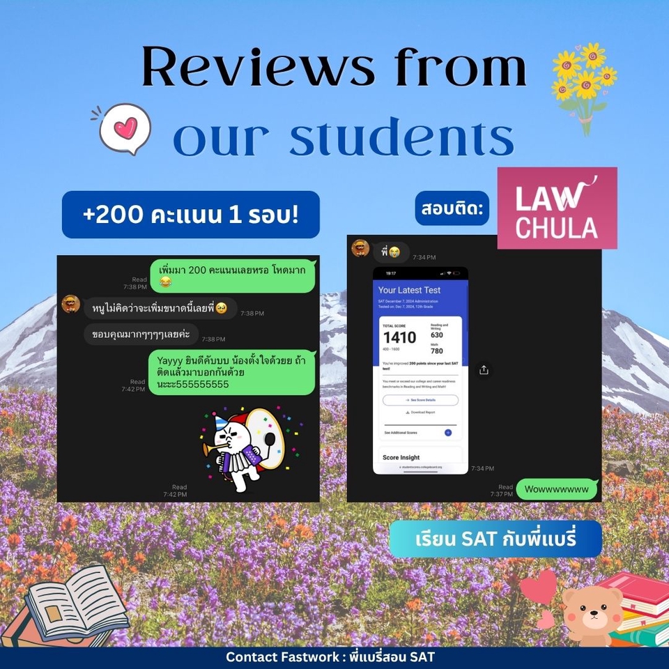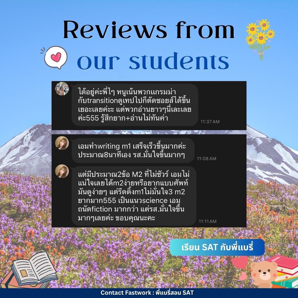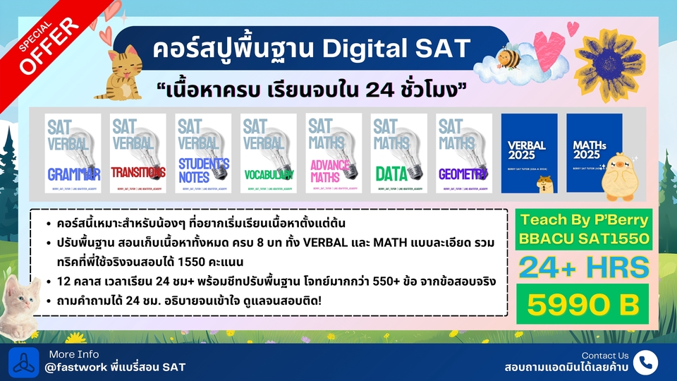 คอร์สปรับพื้นฐาน SAT สอนโดยพี่แบรี่ BBACU SAT 1550 คะแนน (4 รอบ) · คอร์สนี้เหมาะสำหรับน้องๆ ที่อยากเริ่มเรียนเนื้อหาตั้งแต่ต้น · สอนเก็บเนื้อหาทั้งหมด ครบ 8 บทตั้งแต่ต้น ทั้งพาร์ท VERBAL และ MATH อธิบายแนวคิดแต่ละข้อแบบละเอียด รวมทริคที่พี่ใช้จริงจนสอบได้ 1550 คะแนน · 12 คลาส เวลาเรียน 24 ชม+ พร้อมชีทข้อสอบจริงกว่า 2 ชุด โจทย์มากกว่า 500+ ข้อ และ เฉลยและอธิบายแบบละเอียด · ถามคำถามได้ 24 ชม. อธิบายจนเข้าใจ ดูแลจนสอบติด!