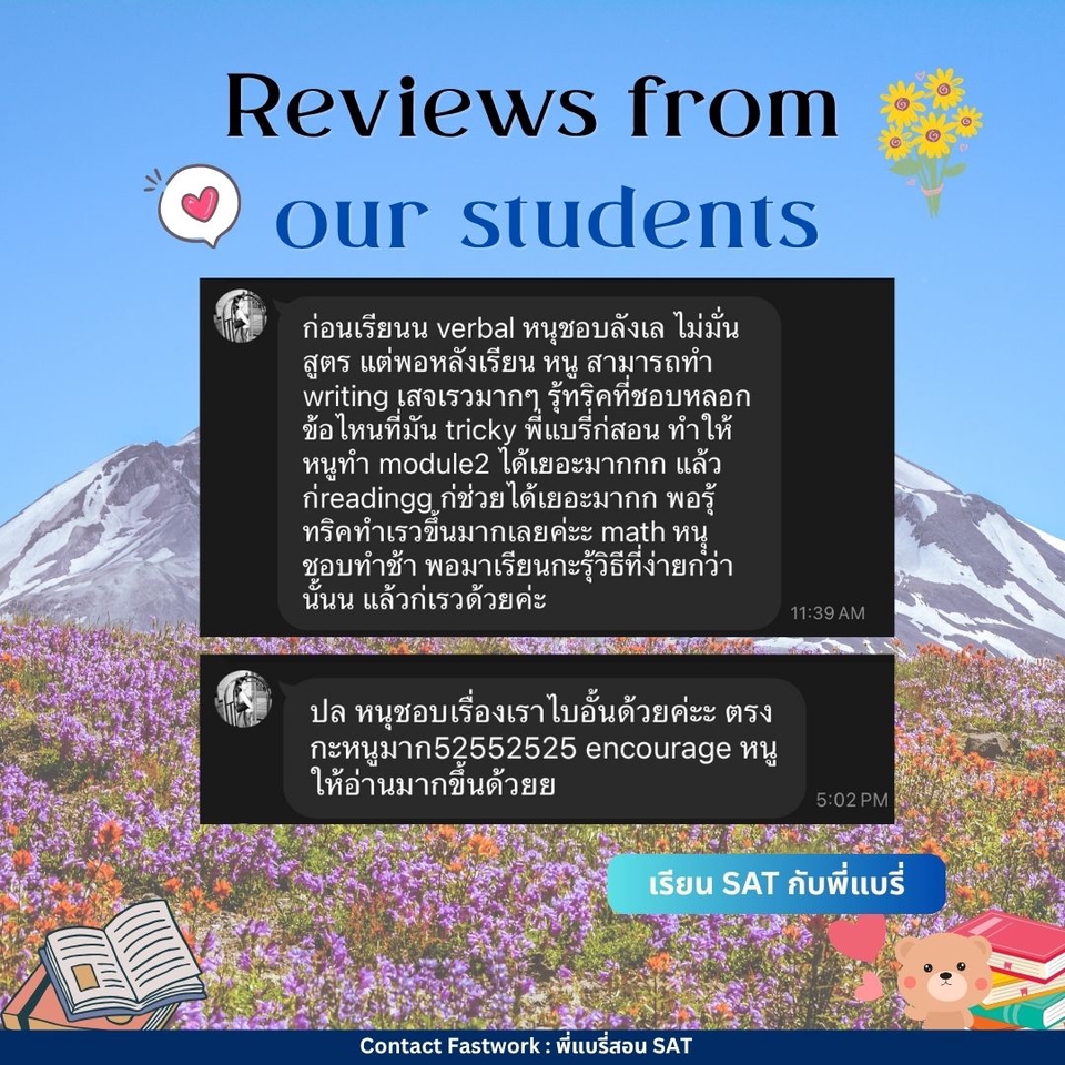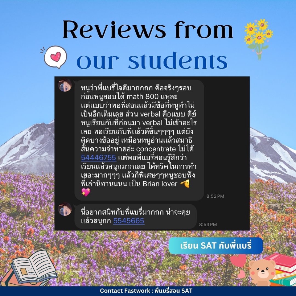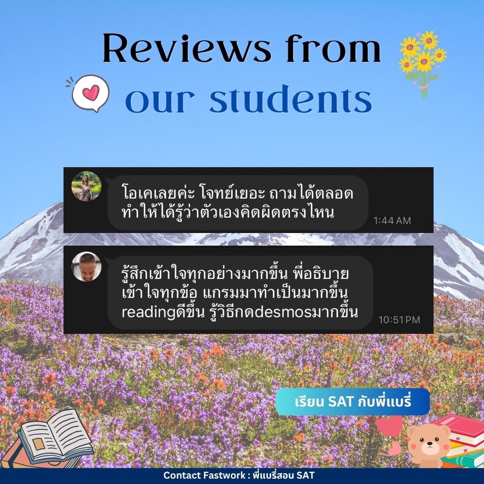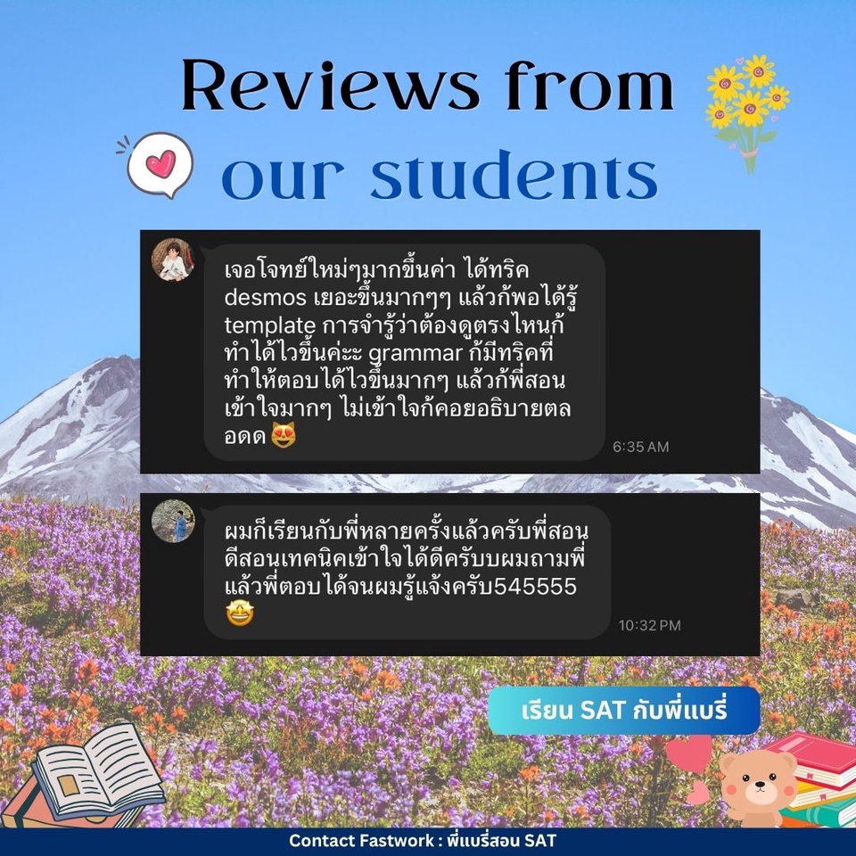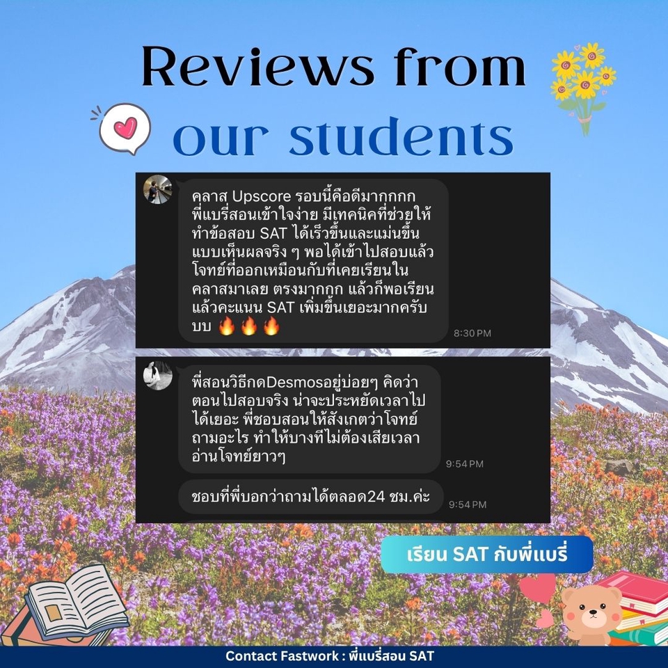 คอร์สปรับพื้นฐาน SAT สอนโดยพี่แบรี่ BBACU SAT 1550 คะแนน (4 รอบ) · คอร์สนี้เหมาะสำหรับน้องๆ ที่อยากเริ่มเรียนเนื้อหาตั้งแต่ต้น · สอนเก็บเนื้อหาทั้งหมด ครบ 8 บทตั้งแต่ต้น ทั้งพาร์ท VERBAL และ MATH อธิบายแนวคิดแต่ละข้อแบบละเอียด รวมทริคที่พี่ใช้จริงจนสอบได้ 1550 คะแนน · 12 คลาส เวลาเรียน 24 ชม+ พร้อมชีทข้อสอบจริงกว่า 2 ชุด โจทย์มากกว่า 500+ ข้อ และ เฉลยและอธิบายแบบละเอียด · ถามคำถามได้ 24 ชม. อธิบายจนเข้าใจ ดูแลจนสอบติด!