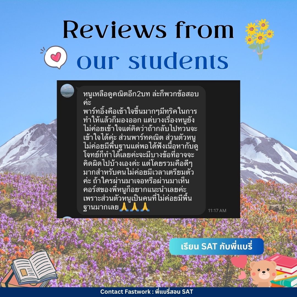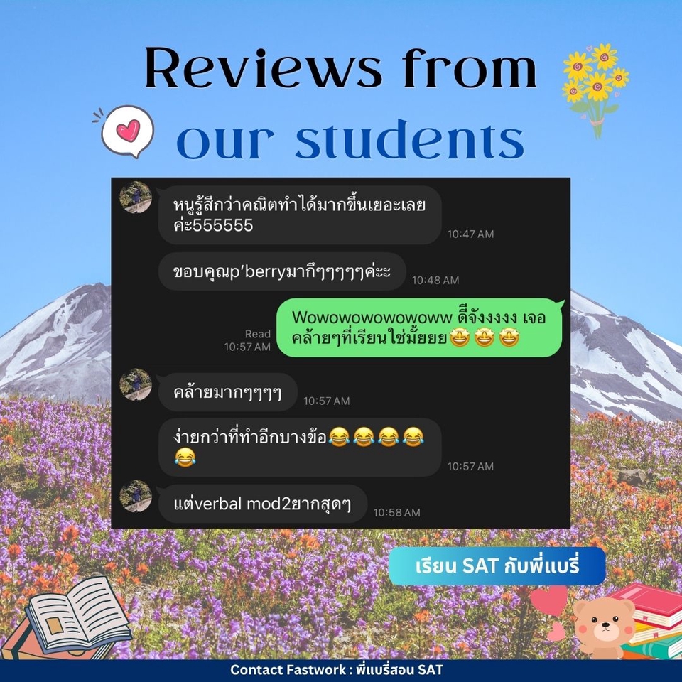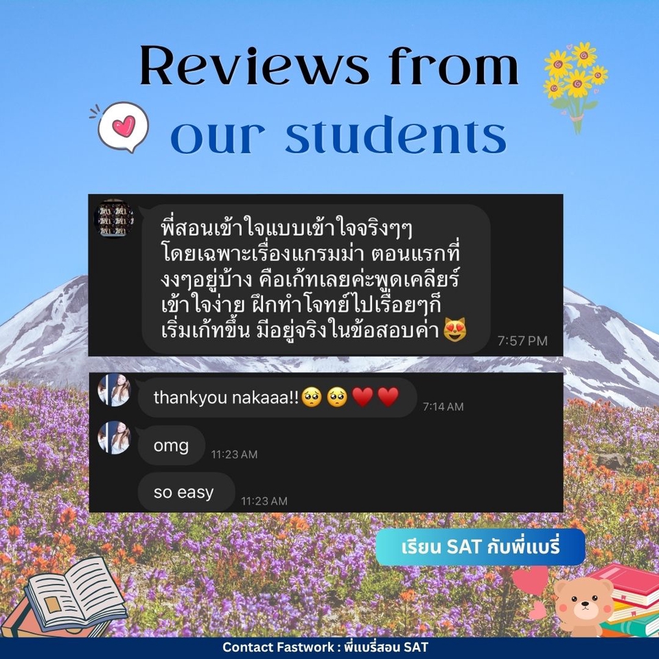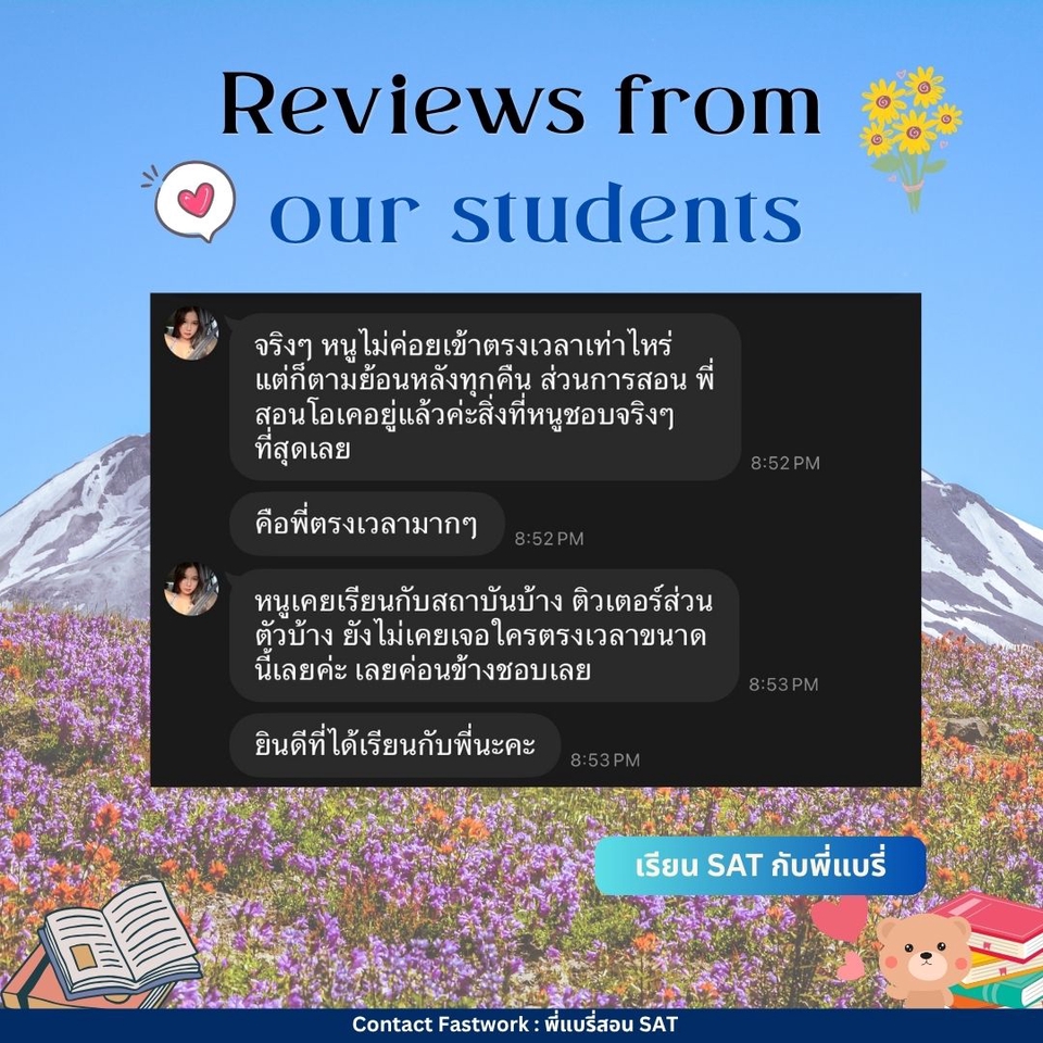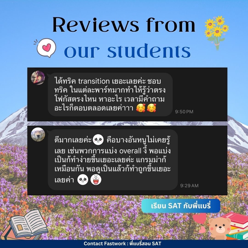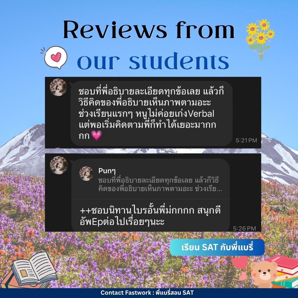 คอร์สปรับพื้นฐาน SAT สอนโดยพี่แบรี่ BBACU SAT 1550 คะแนน (4 รอบ) · คอร์สนี้เหมาะสำหรับน้องๆ ที่อยากเริ่มเรียนเนื้อหาตั้งแต่ต้น · สอนเก็บเนื้อหาทั้งหมด ครบ 8 บทตั้งแต่ต้น ทั้งพาร์ท VERBAL และ MATH อธิบายแนวคิดแต่ละข้อแบบละเอียด รวมทริคที่พี่ใช้จริงจนสอบได้ 1550 คะแนน · 12 คลาส เวลาเรียน 24 ชม+ พร้อมชีทข้อสอบจริงกว่า 2 ชุด โจทย์มากกว่า 500+ ข้อ และ เฉลยและอธิบายแบบละเอียด · ถามคำถามได้ 24 ชม. อธิบายจนเข้าใจ ดูแลจนสอบติด!