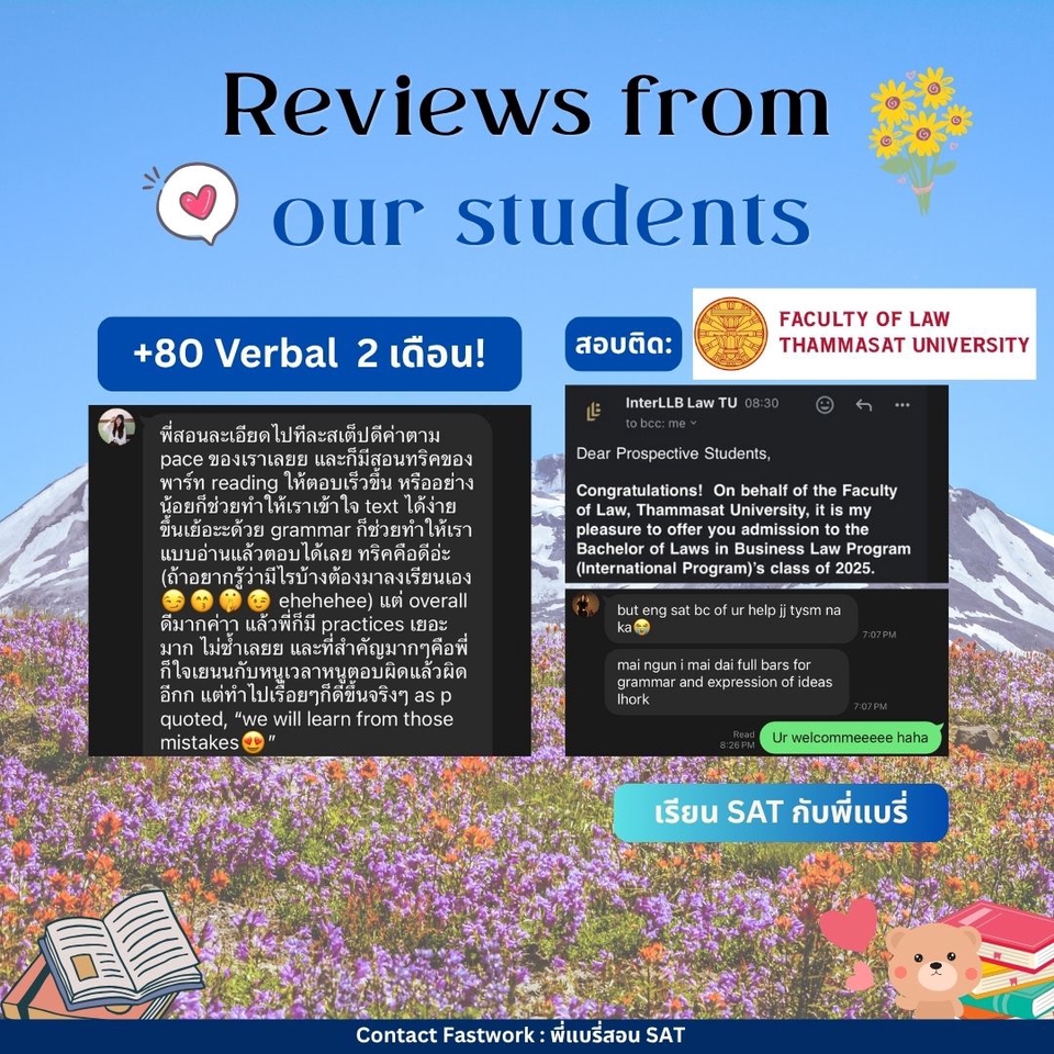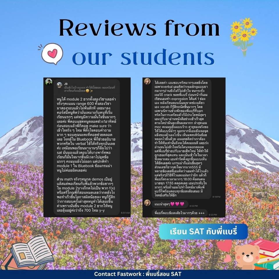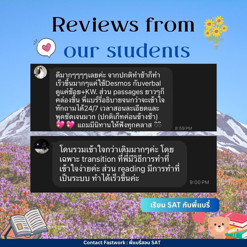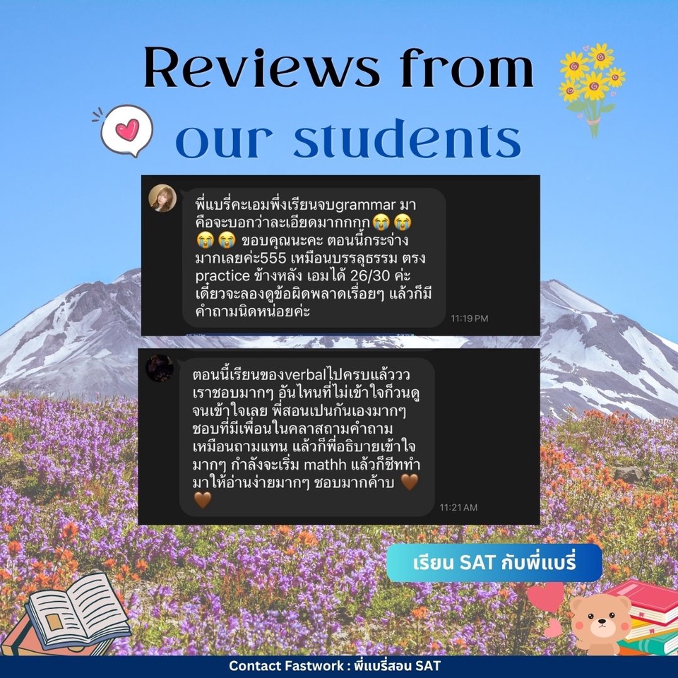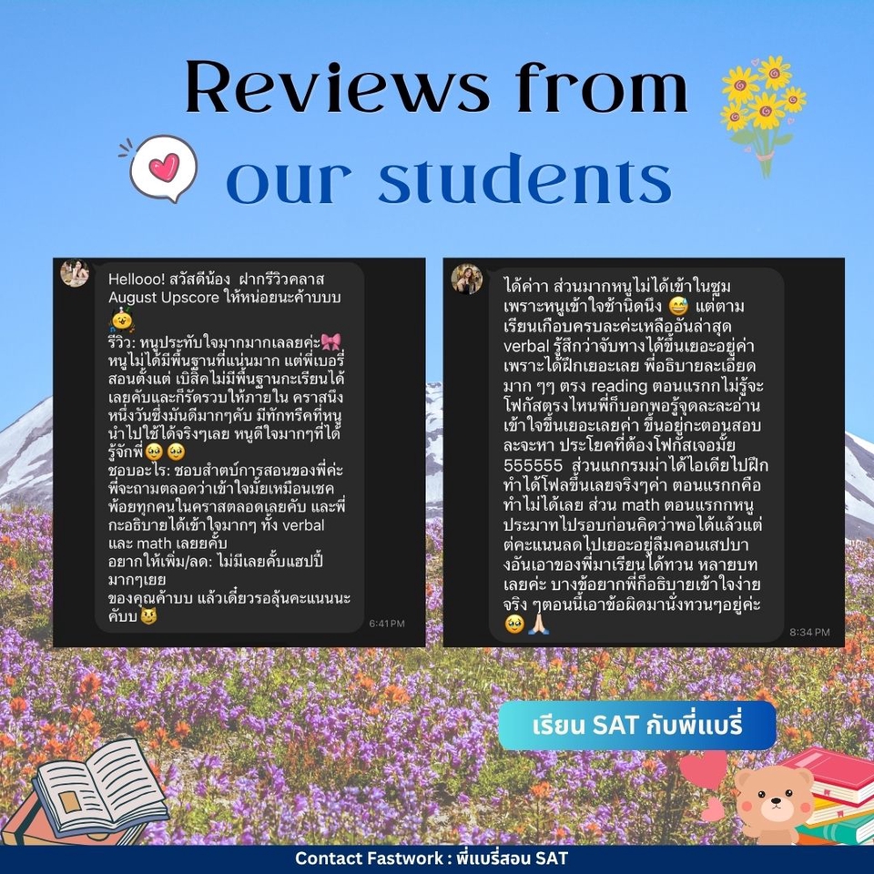 คอร์สปรับพื้นฐาน SAT สอนโดยพี่แบรี่ BBACU SAT 1550 คะแนน (4 รอบ) · คอร์สนี้เหมาะสำหรับน้องๆ ที่อยากเริ่มเรียนเนื้อหาตั้งแต่ต้น · สอนเก็บเนื้อหาทั้งหมด ครบ 8 บทตั้งแต่ต้น ทั้งพาร์ท VERBAL และ MATH อธิบายแนวคิดแต่ละข้อแบบละเอียด รวมทริคที่พี่ใช้จริงจนสอบได้ 1550 คะแนน · 12 คลาส เวลาเรียน 24 ชม+ พร้อมชีทข้อสอบจริงกว่า 2 ชุด โจทย์มากกว่า 500+ ข้อ และ เฉลยและอธิบายแบบละเอียด · ถามคำถามได้ 24 ชม. อธิบายจนเข้าใจ ดูแลจนสอบติด!