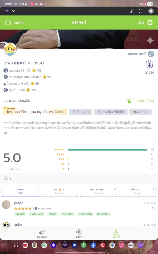 รู้แผนที่ชีวิต พลิกชะตา สร้างเส้นทางแห่งความสำเร็จ โดย อ.พราหมณ์ ศตวรรษ บุนนาค “ฟ้ามืดเมื่อมีได้ ก็ฟ้าสว่างย่อมต้องมี แสงทองย่อมส่องเหนือธรณี เพื่อท้าทายชีวิตอย่างทรนง” มนุษย์ทุกคนมีเส้นทางชีวิตของตนเอง หากเรา “รู้แผนที่ชีวิต” เราจะสามารถ เปลี่ยนชะตา พลิกวิกฤตให้เป็นโอกาส และเดินไปสู่ความสำเร็จได้อย่างมั่นคง การรู้ดวงชะตา ไม่ใช่เพื่อยึดติดกับโชค แต่เพื่อเข้าใจพลังของตนเอง เห็นจุดแข็ง จุดอ่อน และรู้วิธีเสริมให้ชีวิตสมดุล เหมือนมี GPS นำทางชีวิต คอยชี้เส้นทางที่ถูกต้อง ปลอดภัย และนำไปสู่เป้าหมายที่เราปรารถนา ทำไมควรรู้แผนที่ชีวิตของตนเอง - เพื่อวิเคราะห์พลังชีวิต จุดแข็งและจุดอ่อนในดวง - เพื่อปรับเส้นทางชะตาให้สอดคล้องกับพลังจักรวาล - เพื่อวางแผนรับมือกับอุปสรรคและโอกาสในอนาคต - เพื่อเสริมดวง เพิ่มพลังแห่งความสำเร็จและโชคลาภ อย่าปล่อยให้โอกาสดีๆ หลุดลอยไปโดยไม่รู้ตัว เพราะ “การรู้ชะตาชีวิต เหมือนได้แผนที่พาเราไปถึงเป้าหมายโดยไม่หลงทาง” ไม่มีใครอยากใช้ชีวิตแบบเดินเรื่อยเปื่อยในเส้นทางที่ไม่รู้ว่าข้างหน้ามีอุปสรรคหรือภัยอันตรายหรือไม่ แต่หากเรามีเข็มทิศชีวิตที่ชัดเจน เห็นเส้นทางแห่งความสำเร็จ เราก็สามารถเตรียมตัวรับมือทุกสิ่งได้อย่างมั่นใจและถูกทิศทาง การตรวจดวงชะตาจึงไม่ใช่เรื่องงมงาย แต่คือศาสตร์แห่งการรู้จักตนเอง เพื่อใช้ชีวิตอย่างมีสติ และวางแผนอนาคตอย่างรอบคอบ บริการตรวจดวงและวางแผนชีวิตโดย อ.พราหมณ์ ศตวรรษ บุนนาค เป็นนักพยากรณ์ผู้เชี่ยวชาญด้านโหราศาสตร์ ให้บริการดูดวงทั้งส่วนตัวและในแอปพลิเคชันชื่อดัง อาทิ A ดวง, ดวง Live, Horoworld และดวง 360° อาจารย์พราหมณ์เป็นศิษย์สายตรงจากสถาบันพยากรศาสตร์ โดยได้รับการถ่ายทอดวิชาโหราศาสตร์จาก อ.ลักษณ์ เรขานิเทศ (โหรฟันธง) อ.นพเก้า สนธิสุวรรณ , อ.พราหมณ์เมศ วาสุเทพ รวมถึงได้รับคำแนะนำจากตำราของอาจารย์ผู้ทรงคุณวุฒิอีกหลายท่าน เช่น อ.ยอดธง ทับทิมไม้, อ.ศ. ดุสิต, อ.เทพ สาริกบุตร, อ.สิงโต สุริยาอารักษ์, อ.อักษร ไพบูลย์, อ.ร.ต.อ. เปี่ยม บุญโชติ,อ. อรุณ ลำเพ็ญ และ อ.คุณหญิง ชิต โภชากร เป็นต้น ปรัชญาการพยากรณ์ของอาจารย์ “พูดตรง ไม่เยิ่นเย้อ ไม่หลอกลวง ไม่ปลอบใจด้วยความเท็จ ใช้ศาสตร์เพื่อความจริง ใช้ความจริงเพื่อเปลี่ยนชีวิต” อย่ารอให้ชะตาชีวิตเป็นผู้กำหนดทางเดินของคุณ จงลุกขึ้น “รู้ดวงชะตาเพื่อกำหนดทางเดินของตัวเอง” เริ่มต้นวันนี้ เพื่อพรุ่งนี้ที่มั่นคงและสว่างกว่าเดิม 💬 ปรัชญาการพยากรณ์ของอาจารย์ “พูดตรง ไม่เยิ่นเย้อ ไม่ปลอบใจด้วยความเท็จ ใช้ศ