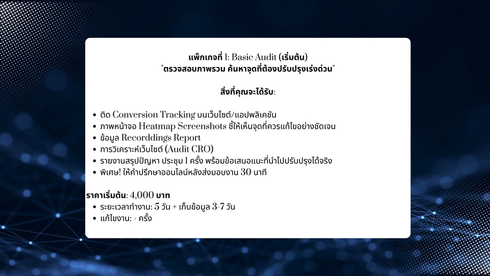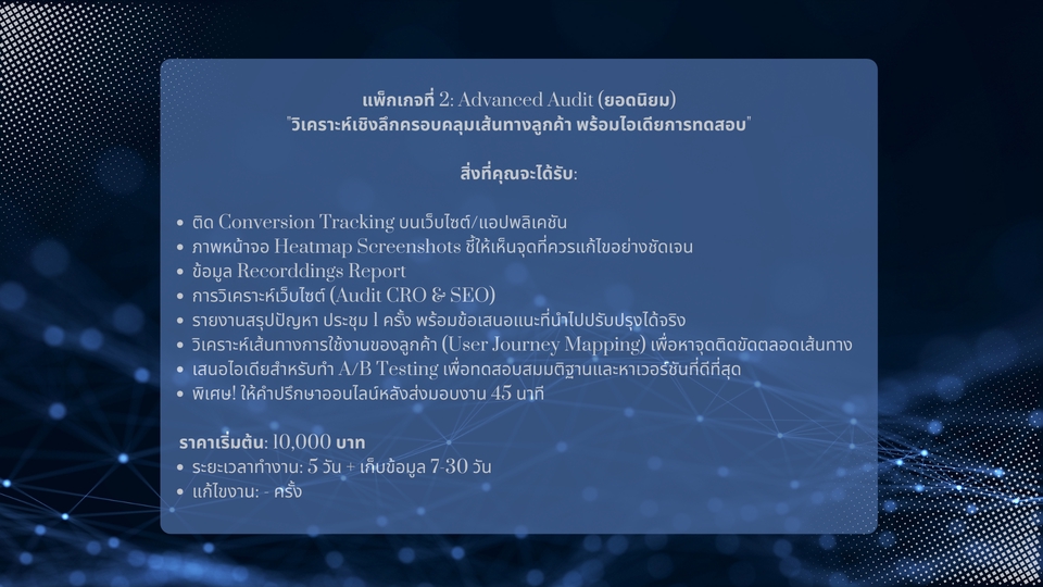 ฿10,000"วิเคราะห์เชิงลึกครอบคลุมเส้นทางลูกค้า พร้อมไอเดียการทดสอบ"