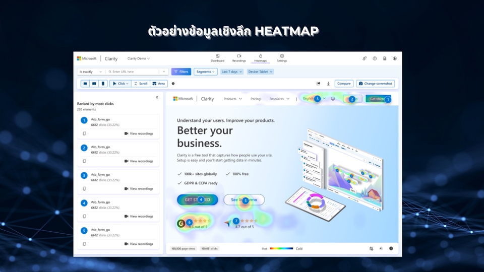 - • ภาพหน้าจอ Heatmap Screenshots ชี้ให้เห็นจุดที่ควรแก้ไขอย่างชัดเจน