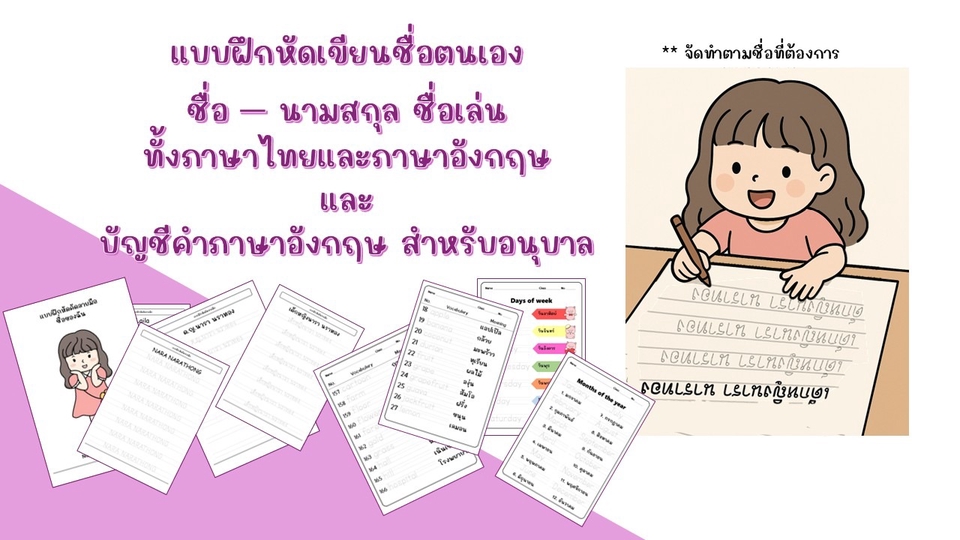 แบบฝึกหัดเขีนชื่อตัวเอง ทั้งภาษาไทยและภาษาอังกฤษ พร้อมคำศัพท์ภาษาอังกฤษ สำหรับชั้นอนุบาล 3 ไฟล์ PDF ไม่มีลายน้ำ **รบกวนส่งชื่อ-นามสกุล ชื่อเล่น ทั้งภาษาไทยและภาษาอังกฤษ เพื่อจัดทำไฟล์เขียนชื่อค่ะ
